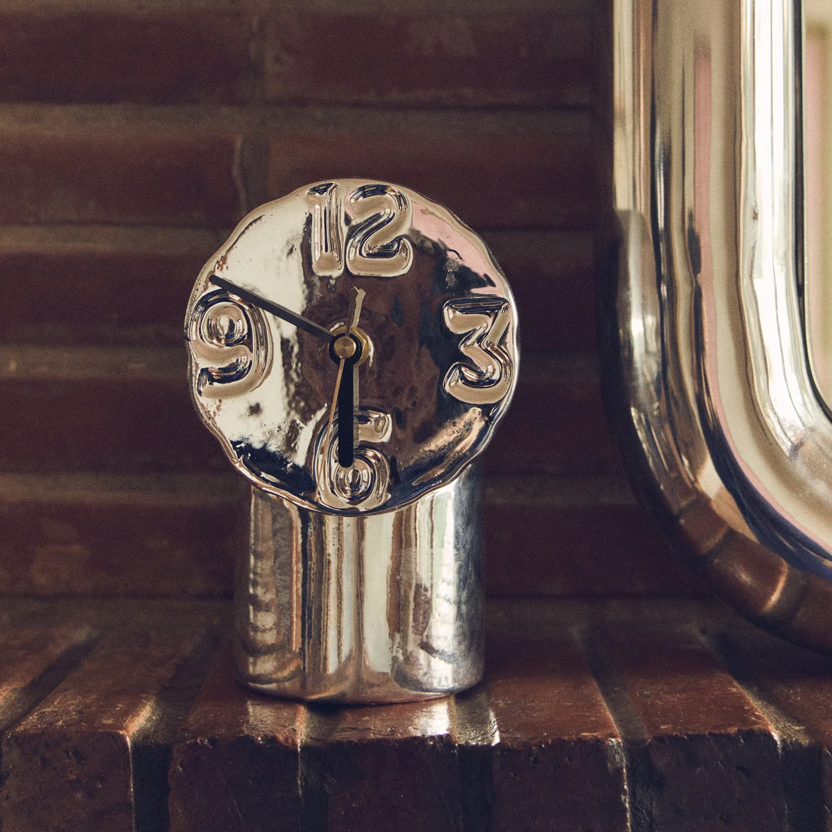 The retro ceramic table clock from HKliving combines functionality with nostalgic charm. Thanks to the handcrafted finish and the natural imperfections that arise during the firing process, each clock is a unique work of art. The shiny chrome glaze and hand-painted dial give the clock a subtle metallic shimmer that catches the light beautifully. The elegant chrome finish adds depth and a polished look that will be an eye-catcher in any room. With its compact size and refreshing hue, this table clock effortlessly combines the charm of yesteryear with modern design, making it a timeless highlight in your home.