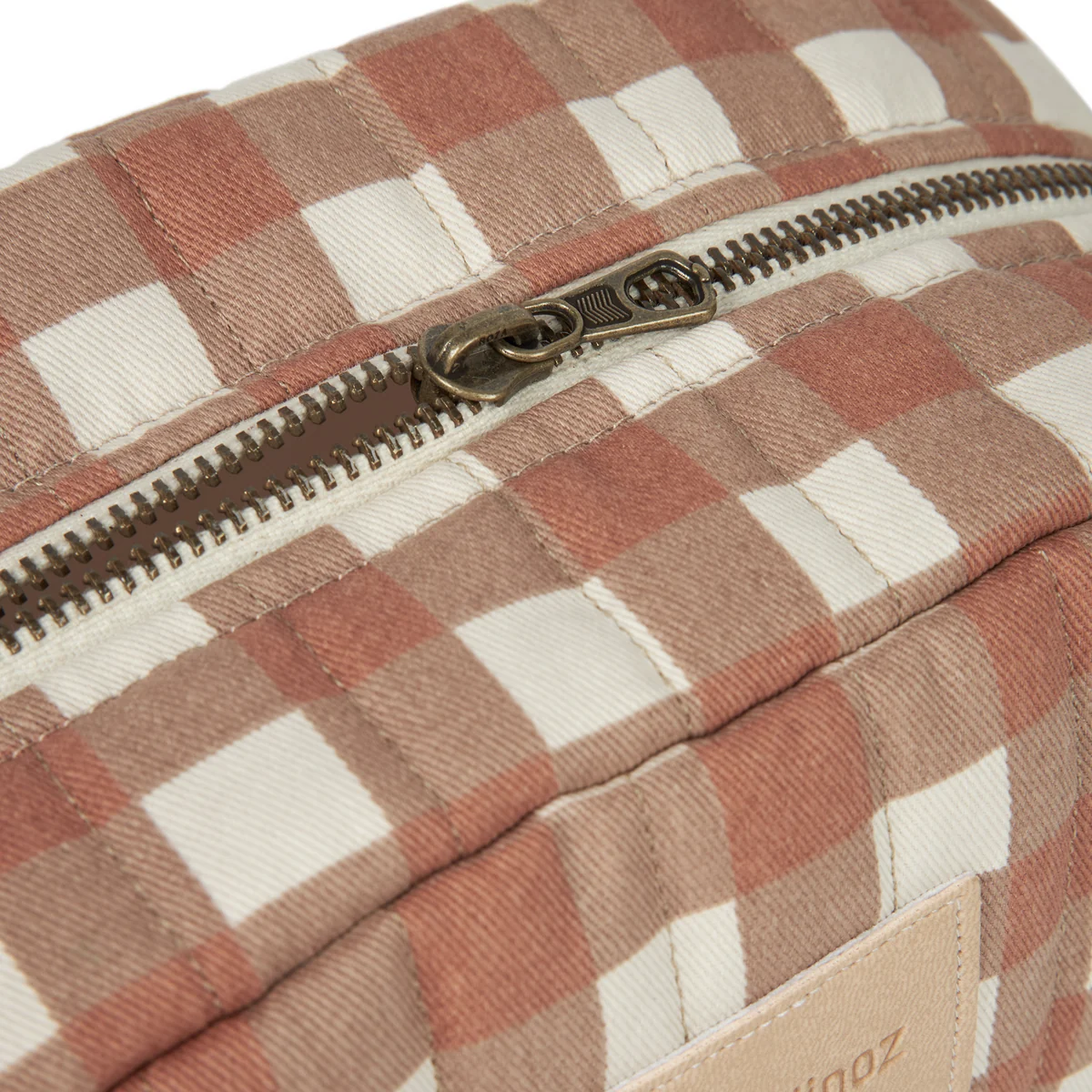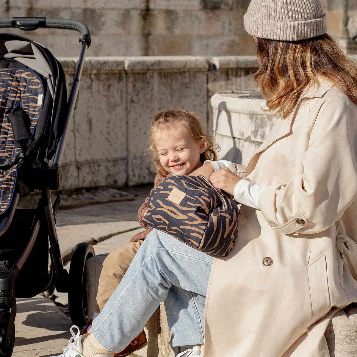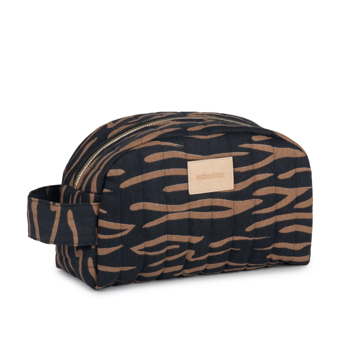 The Hyde Park cosmetic bag from the manufacturer Nobodinoz provides order in a pretty way. The outside is made of printed and quilted organic cotton. The inner lining is waterproof, so that hygiene items and baby accessories can be stored easily. The small handle on the side allows simple carrying of the bag. The cosmetic bag closes with a zipper. Made in Barcelona.