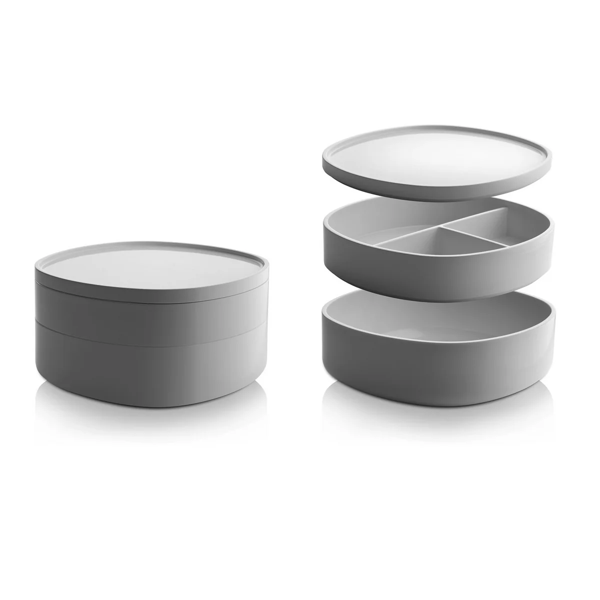 The bathroom container by the designer Piero Lissoni brings an unexpected elegance to simple everyday objects. The three-part Birillo box offers space for many small objects such as hair ties and clips, eyelash curlers and make-up. The lower container can hole larger utensils, while the upper compartment is divided into three parts. This makes the box suitable for nearly every utensil in the bathroom.