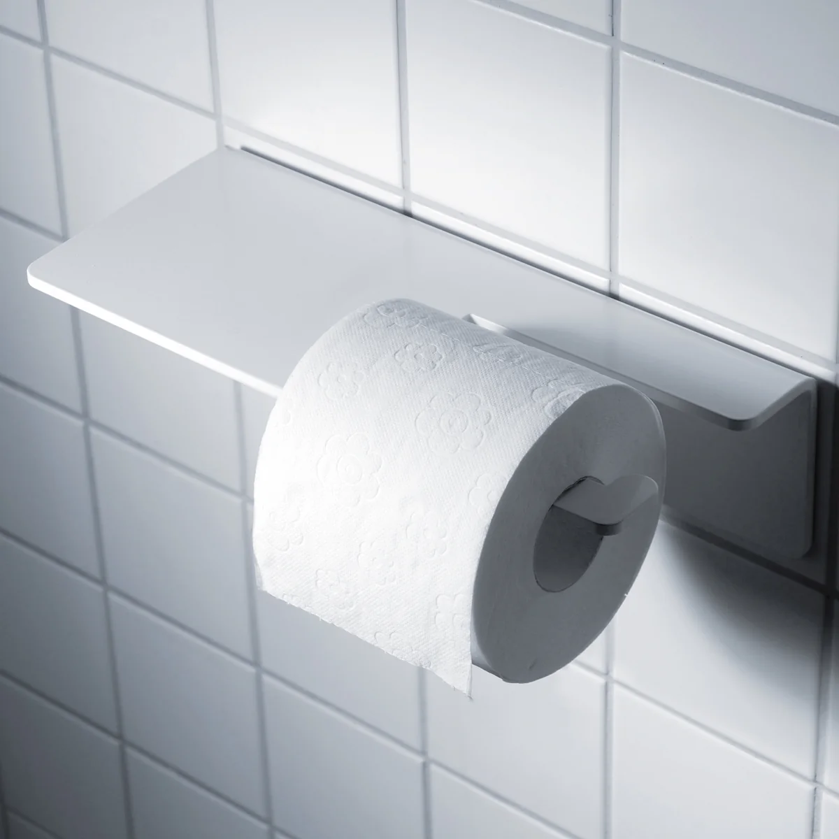The toilet paper holder by Radius Design easily holds toilet paper: easily placed on it, the rolls are exchanged in an instant. A small hook on the holder holds the paper rolls securely. The special something is a small tray on the holder: additional objects fit on the holder, such as a book or wet wipes. That is how everything necessary is near the toilet.