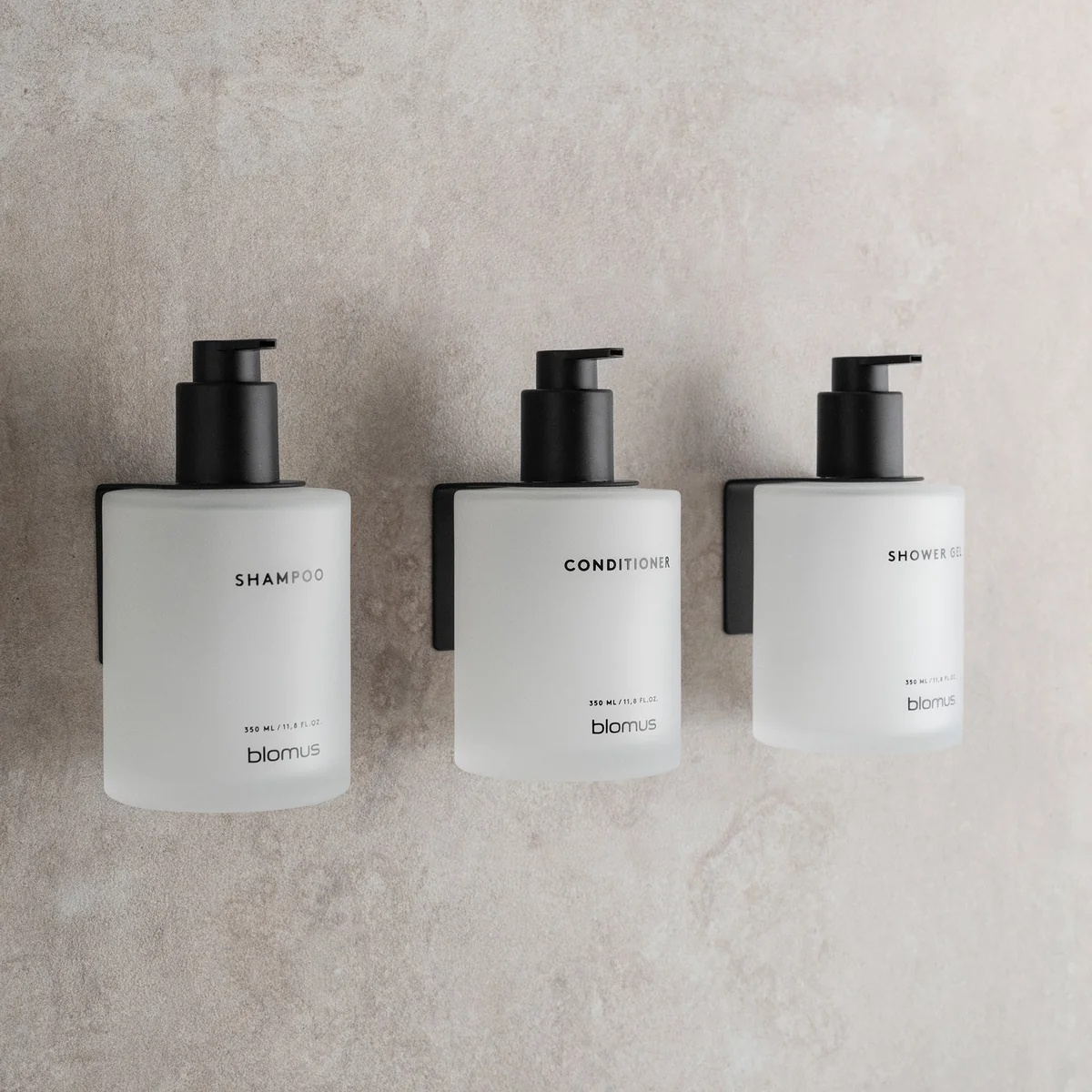 The Kirei glass bottle set from Blomus offers an elegant solution for storing care products. The three glass bottles (350 ml each) are clear in color and offer a robust and stylish way to store shampoo, shower gel and conditioner safely and hygienically. The bottles are equipped with either screw or adhesive holders so that they can be flexibly mounted or positioned.