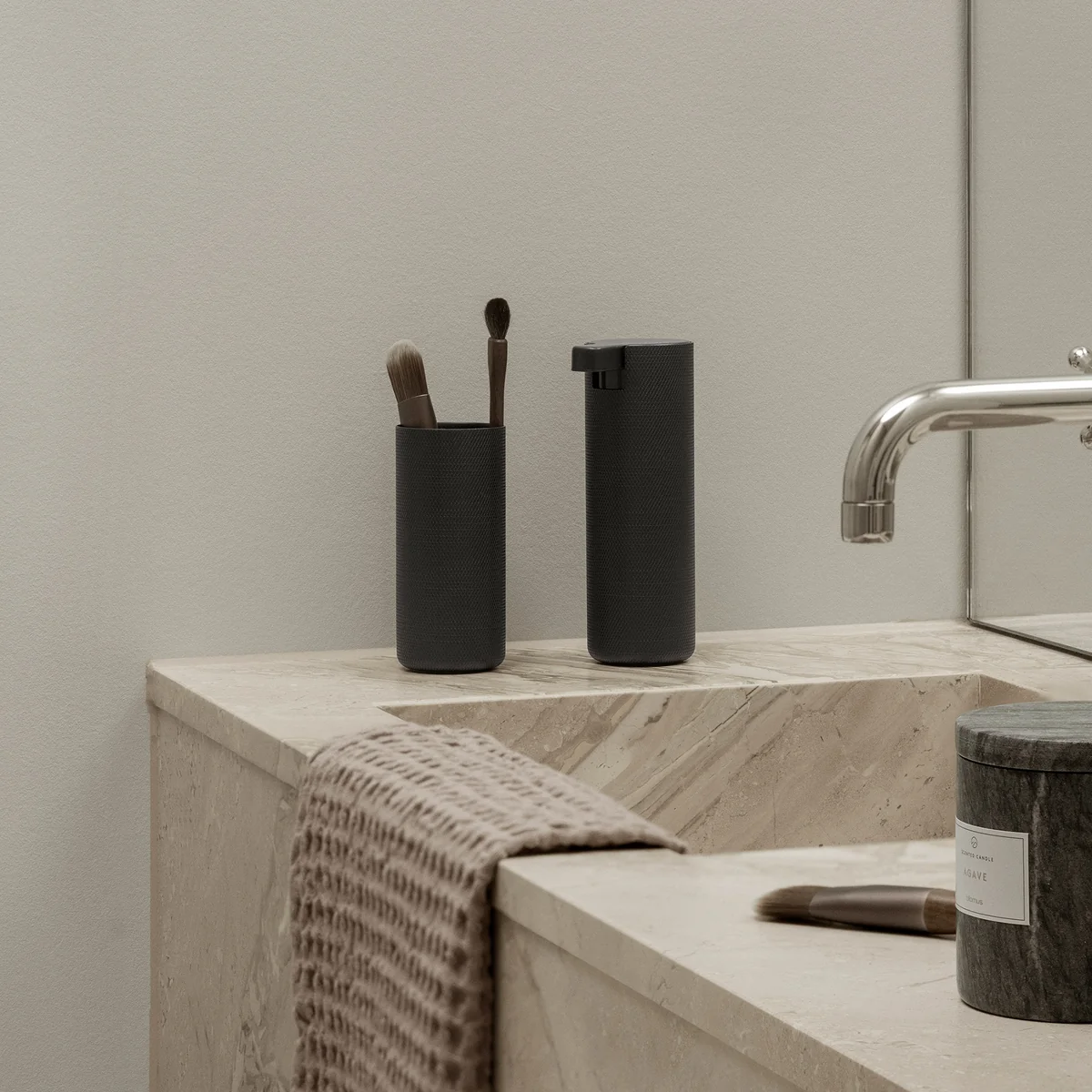 The Modo Rof soap dispenser combines modern design with a luxurious surface finish and sets stylish accents in the bathroom. The knurled surface gives the soap dispenser a pleasant feel and ensures a sophisticated look. The diamond knurling not only visually enhances the surface, but also increases the slip resistance and durability of the material.