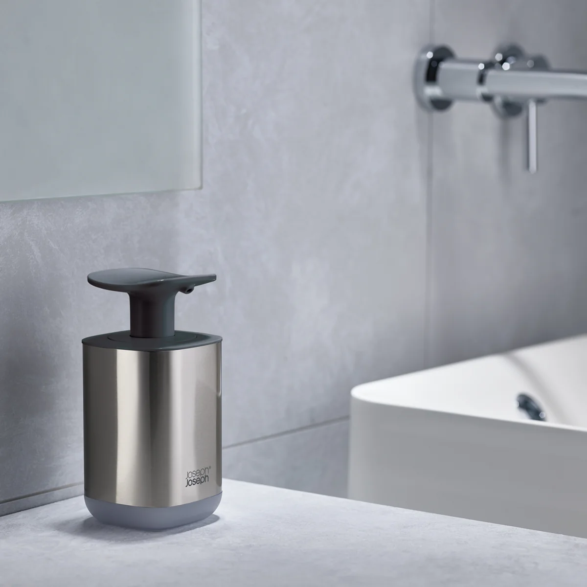 The Presto Steel Soap dispenser from Joseph Joseph has an especially large pump head, which allows the operation with the wrist or forearm. This method of application is particularly hygienic and also practical in case your hands are particularly dirty.