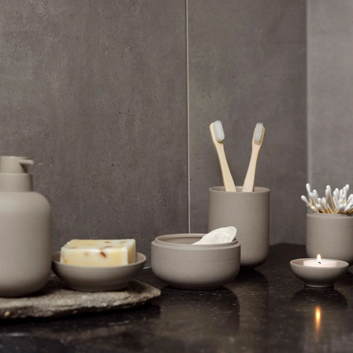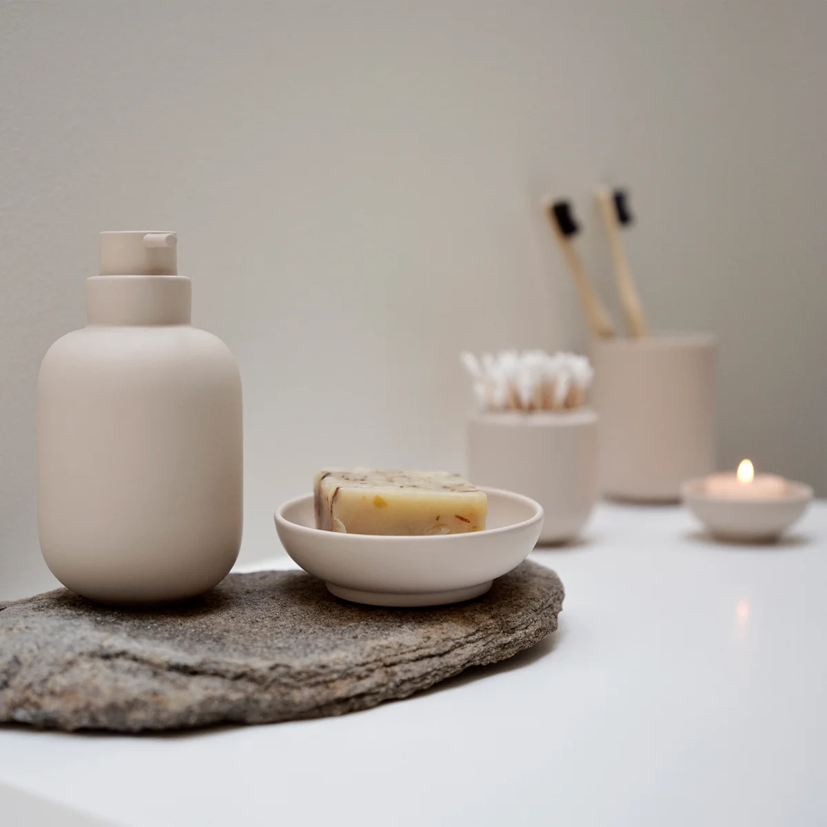 This soap dispenser from the Sensu series combines minimalist design with practical handling. Made from high-quality stoneware, its weight ensures stability, while the soft curves create a harmonious look. The fine pump head enables precise dispensing and blends discreetly into the overall look.