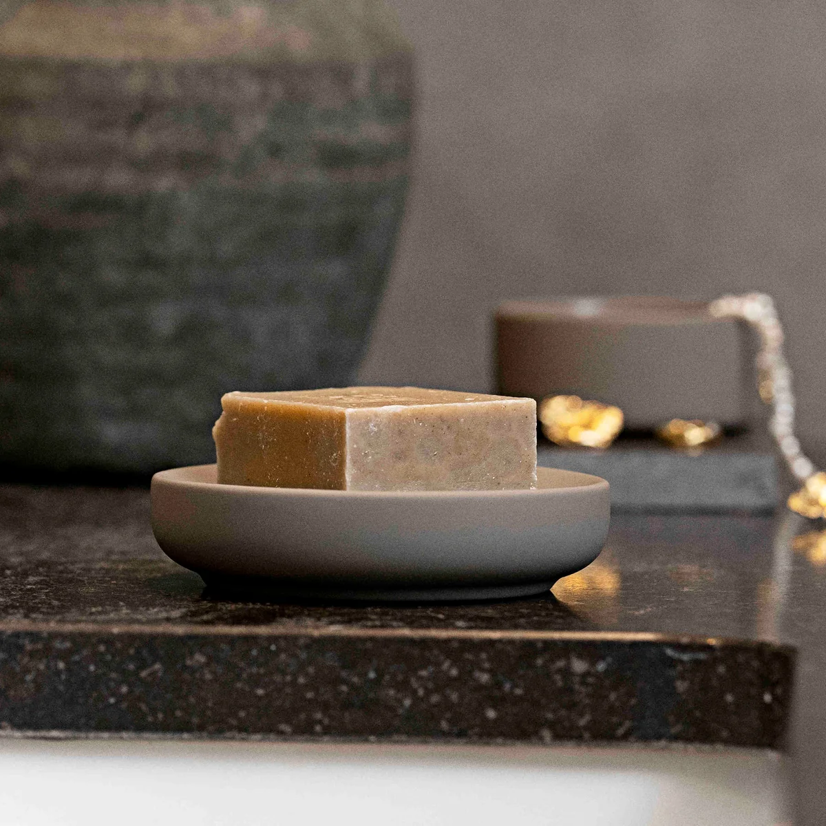 The Ume soap dish is part of the eponymous series of bathroom accessories from Zone Denmark , which are characterized by a simple design, soft contours and a special surface texture. The dish is made from porcelain, which is then finished with a Soft-Touch surface. This not only gives the bowl a high-quality appearance, but also makes it pleasant to the touch.