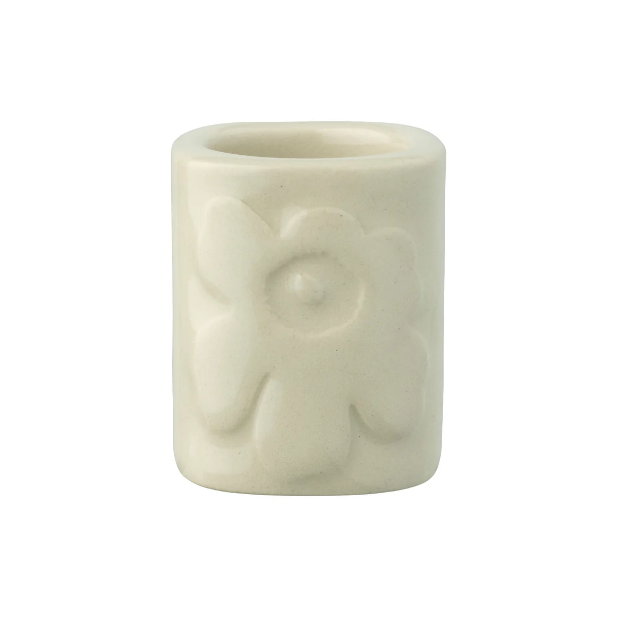 The Unikko toothbrush holder combines practical use with timeless design. Made of stoneware with a transparent glaze, it shows the natural color of the material, giving it a calm, high-quality and authentic appearance. The embossed Unikko pattern gives the container a subtle but unmistakable structure and makes it a decorative element on the washbasin or bathroom shelf.
