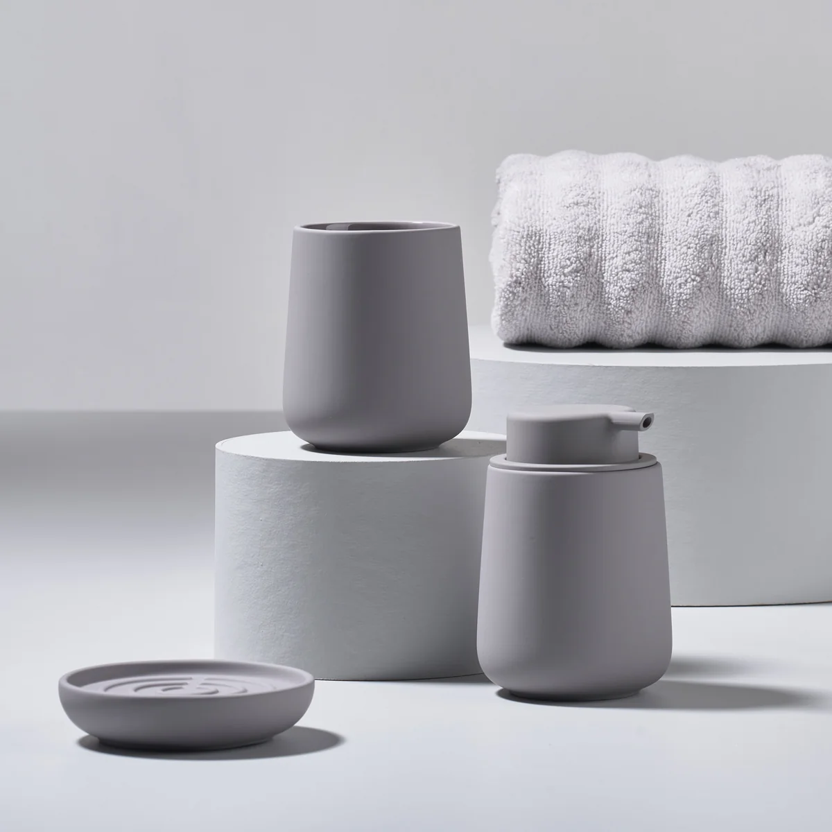The soap dispenser, the toilet brush and the toothbrush tumbler are available in the Nova One Stoneware series are available. The Nova collection includes soap dispensers, toilet brushes, toothbrush mugs and soap dishes in porcelain and a pedal bin in ABS with soft touch coating, which are also available in other colors on request.
