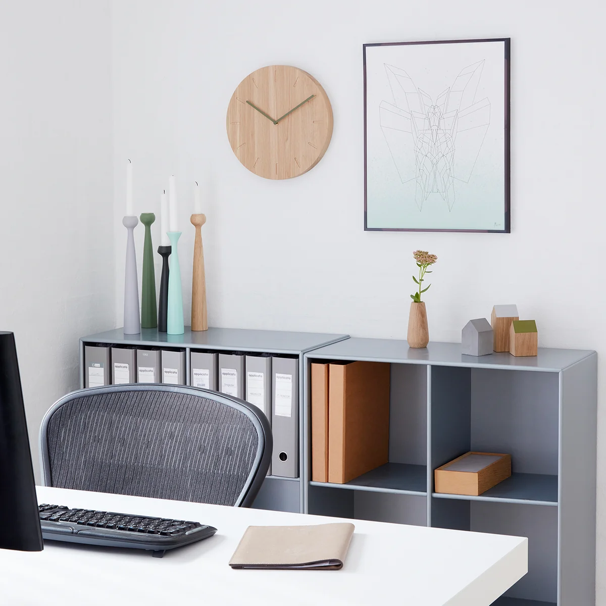 The disc is made of oak wood, the natural grain radiates warmth and gives the watch its natural look. Meanwhile, the brass hands give the Watch:Out a subtle, elegant touch. This means that the applicata wall clock also feels at home in modern home furnishings. The hands are available in different colors, their soft tones - tangerine, brass and grey - harmonize perfectly with the natural oak wood. They make it possible to adapt the clock to different interiors without compromising the pure, rustic essence of the wall clock.