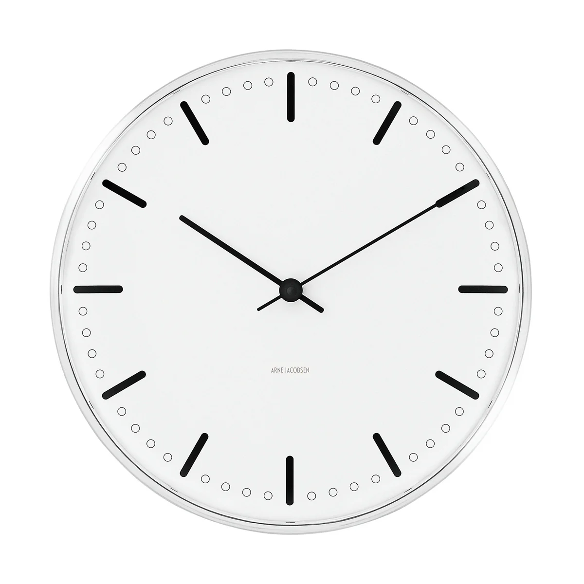 The City Hall wall clock was designed by Arne Jacobsen in 1956 for the Rødovre City Hall. It captivates by its simplicity, because the abstract dial shows the number of hours by strokes and the minutes in dots.