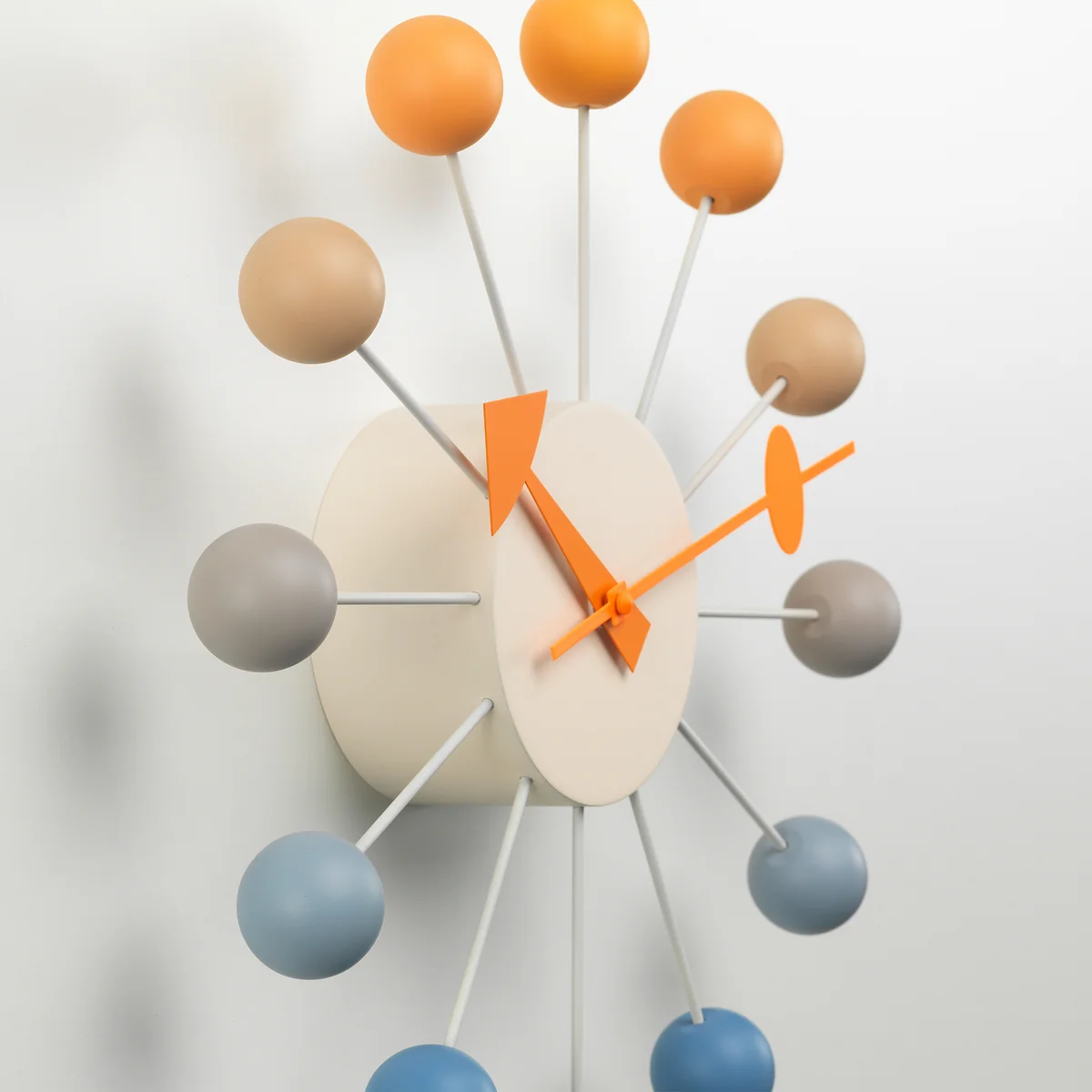 The wall clock is a true-to-the-original re-edition of the 1949 clock designed for the Howard Miller Clock Company. It impresses with a high-quality material processing and sculptural form. The distinctive hour markers and colour-coded hands ensure good readability.