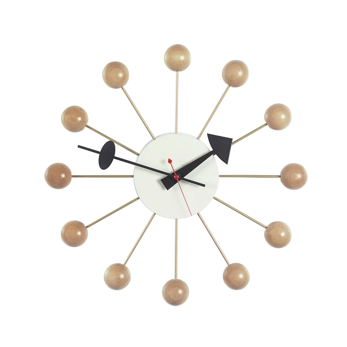 The wall clock is a true-to-the-original re-edition of the 1949 clock designed for the Howard Miller Clock Company. It impresses with a high-quality material processing and sculptural form. The distinctive hour markers and colour-coded hands ensure good readability.
