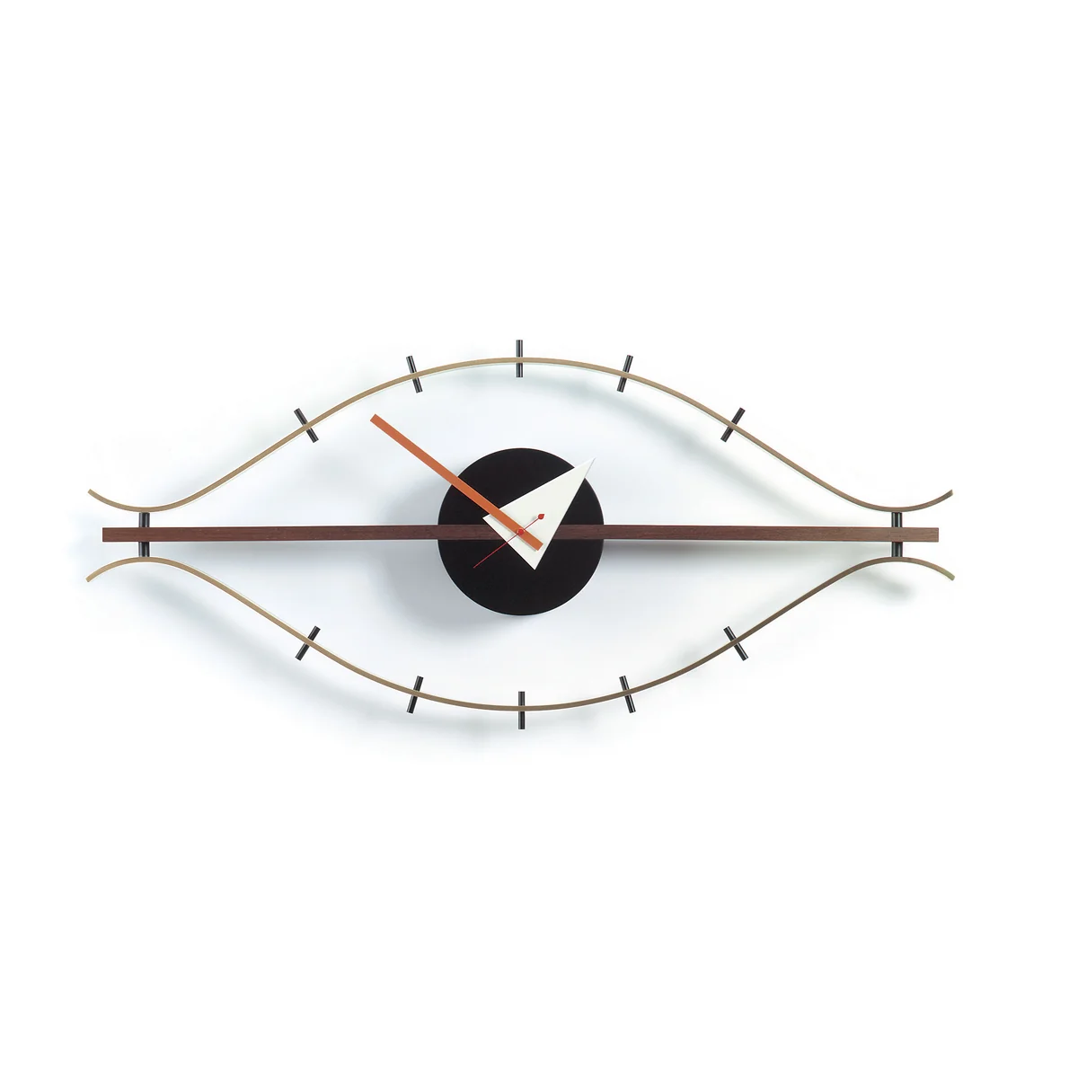 The Eye Wall Clock was designed by George Nelson in 1964. The exceptional clock is produced from brass and walnut by Vitra. Because of its large dimensions of 34 x 76 cm, the it especially optically pleasing.