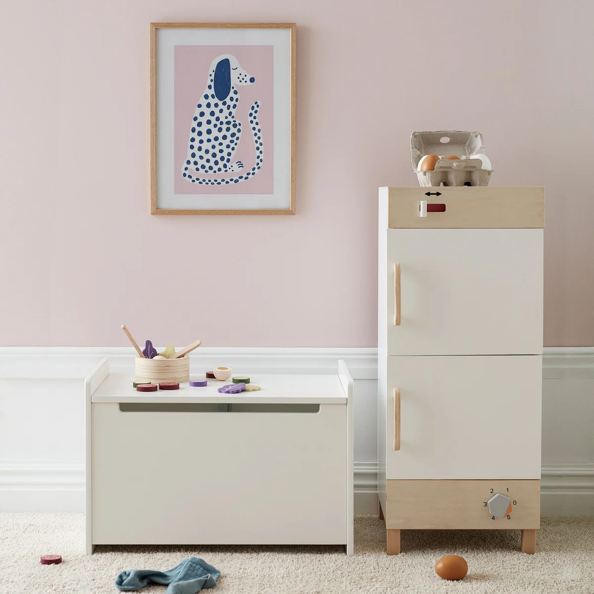 With its generous size, the chest offers enough space for toys, cuddly toys, books and much more. Its timeless design blends seamlessly into any children's room and can even be used as additional seating or as a decorative element.
