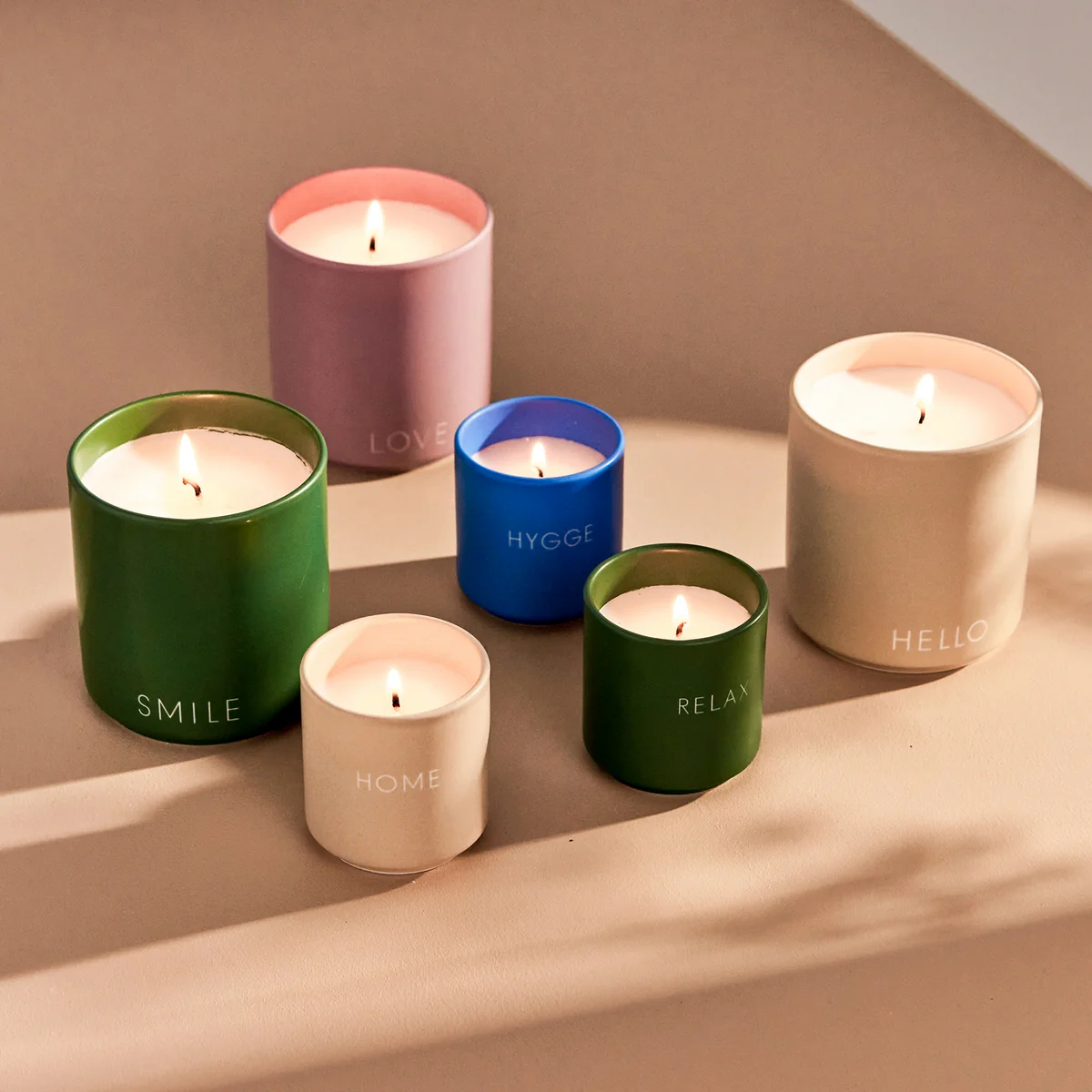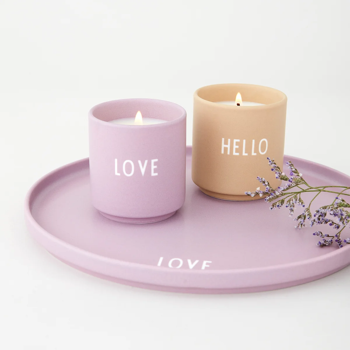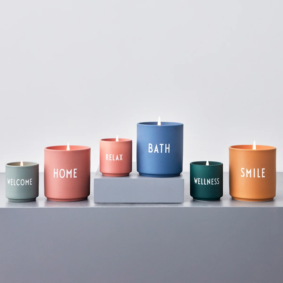 The scented candle is available Design Letters Scented Candle is available in different versions: HOME impresses with natural aromas and a hint of fresh flowers and citrus fruits. SMILE smells of spring flowers, wood and contains notes of fruit. BATH has a calming effect and the fresh, floral scent of lily of the valley and grass.