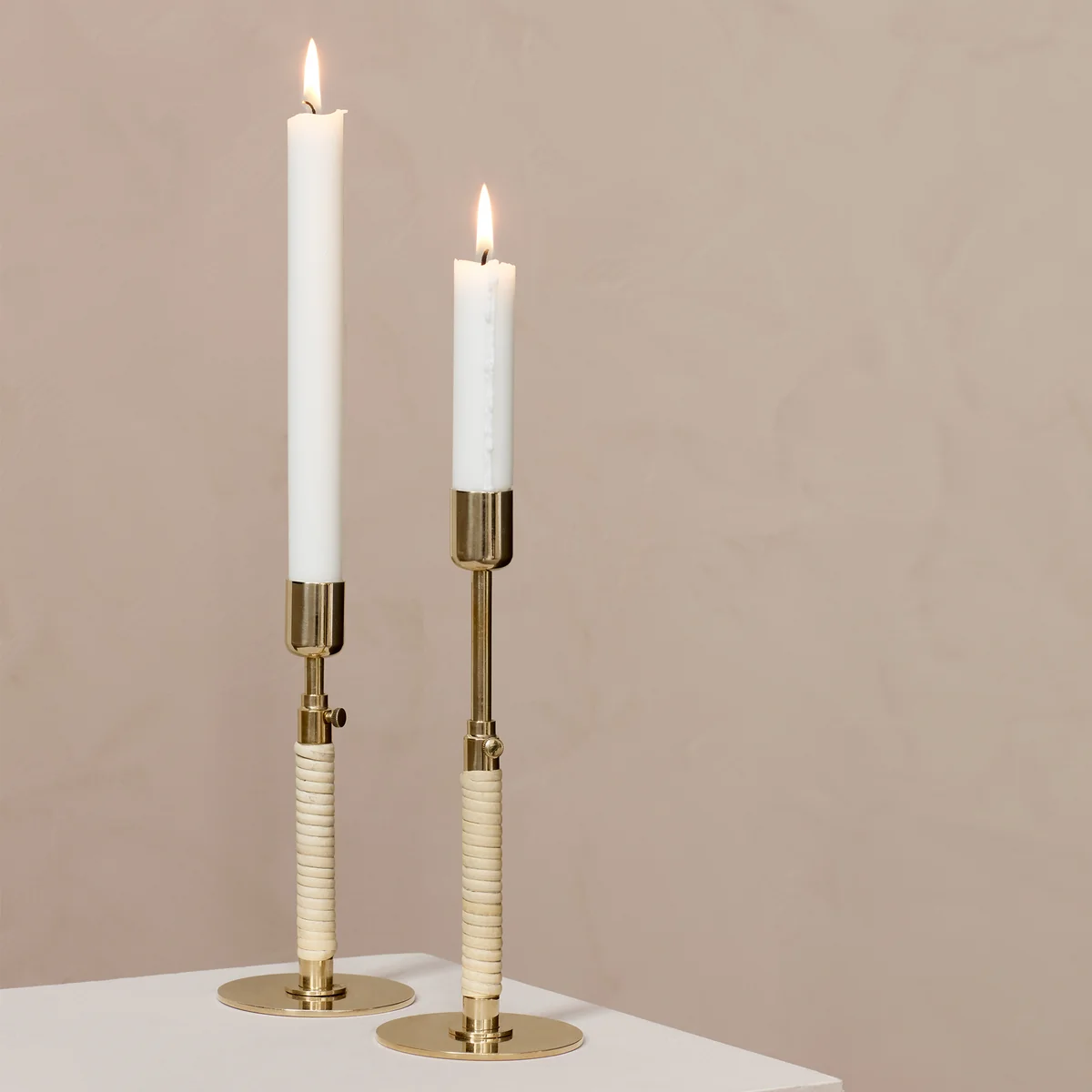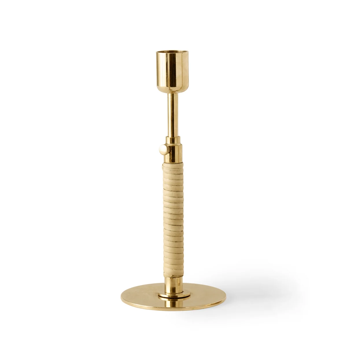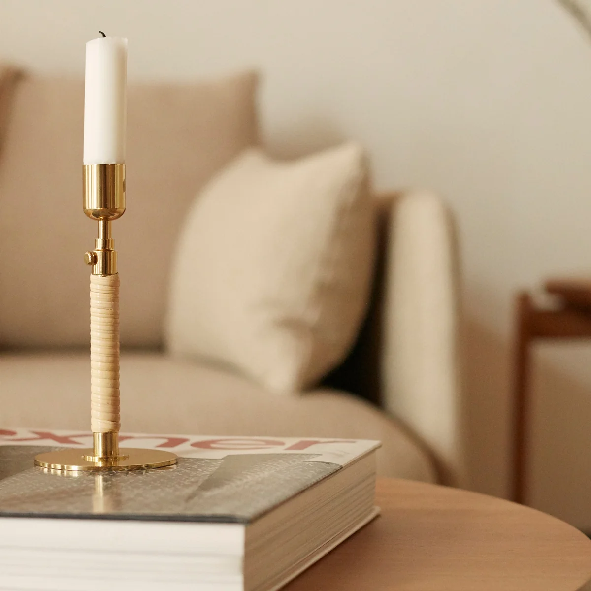 The candle holder Duca from the Danish design studio Krøyer-Sætter-Lassen for Audo is characterized by the combination of different materials as well as its special function: By loosening the screw on the slender shaft, the height of the candle holder can be adjusted while the candle is burning. Made of polished or burnished brass and detailed with rattan wrapped around the lower half, the simple but effective design adds intimacy and warmth to its environment.