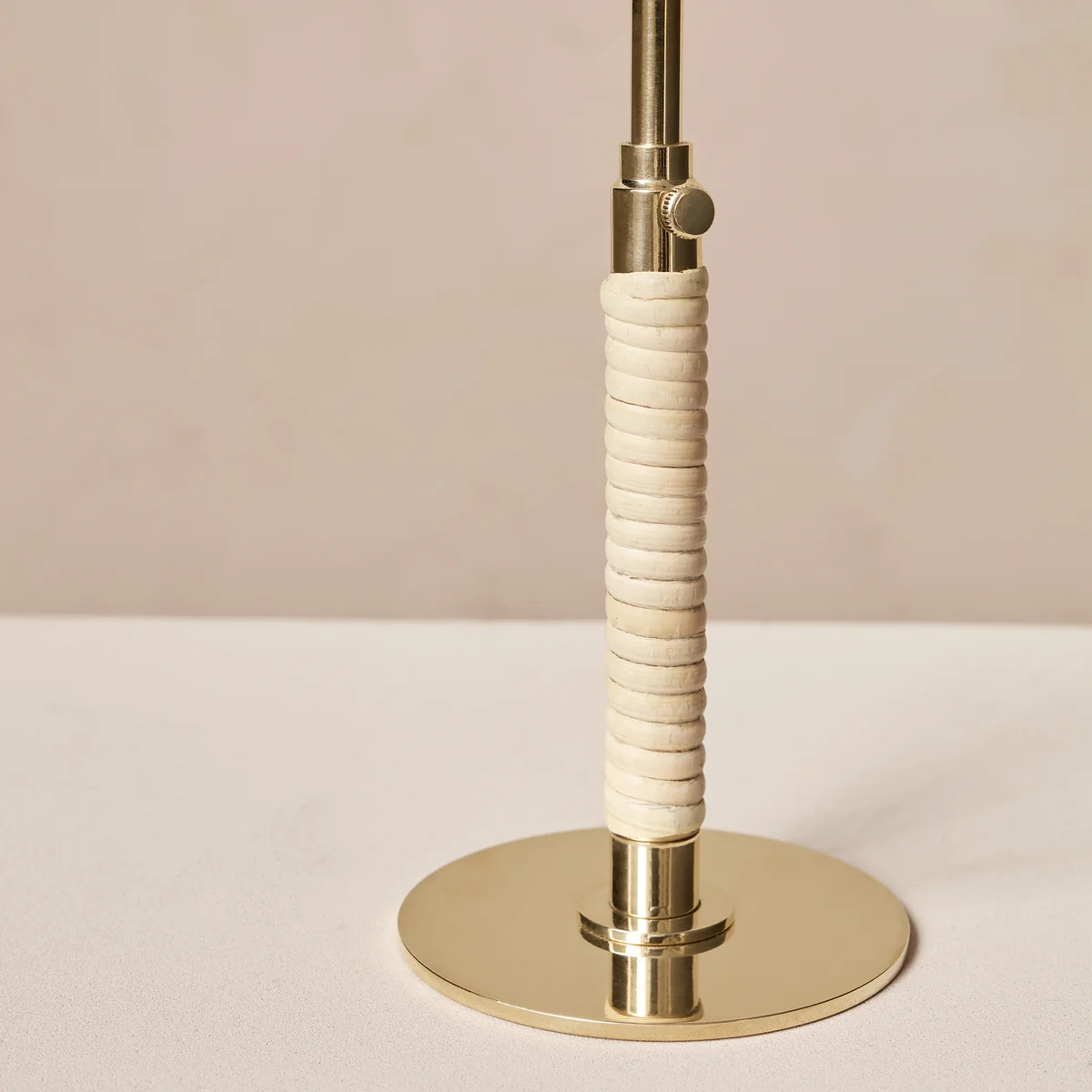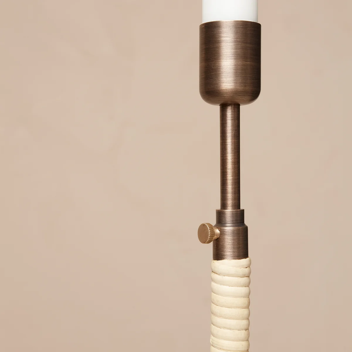 The screw feature challenges the typically static silhouette of the object and allows the user to customize the height of the candlestick by lengthening or shortening it. Available in polished brass or bronzed brass combined with rattan, Duca combines natural materials to create a cozy look in the ambiance.