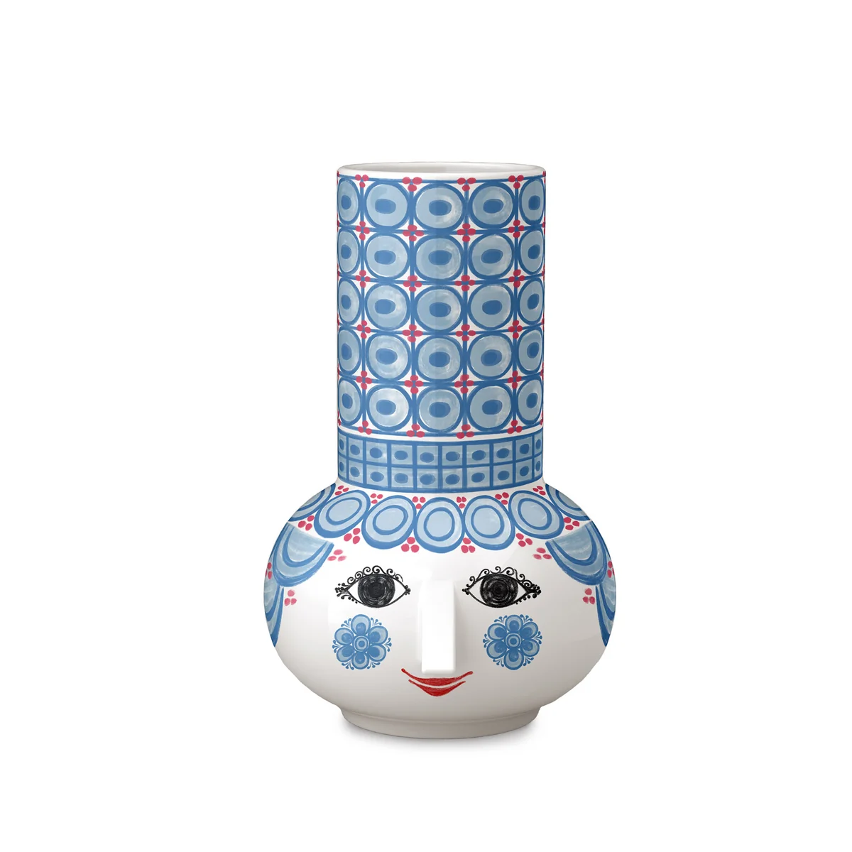 The Olga candle holder from Bjørn Wiinblad combines artistic playfulness and Scandinavian ceramic art. The characteristic figure with a finely crafted face and floral pattern carries a classic candle holder on its head - a typical stylistic element from Wiinblad's imaginative visual language. The glossy glaze gives the candle holder a lively surface, while the striking silhouette makes it a decorative highlight on the table, windowsill or sideboard.