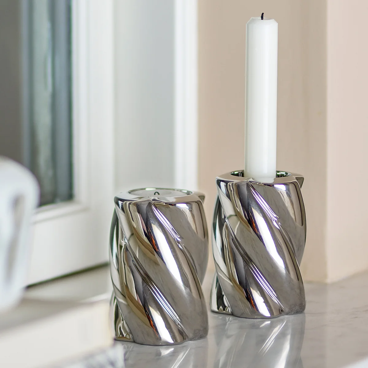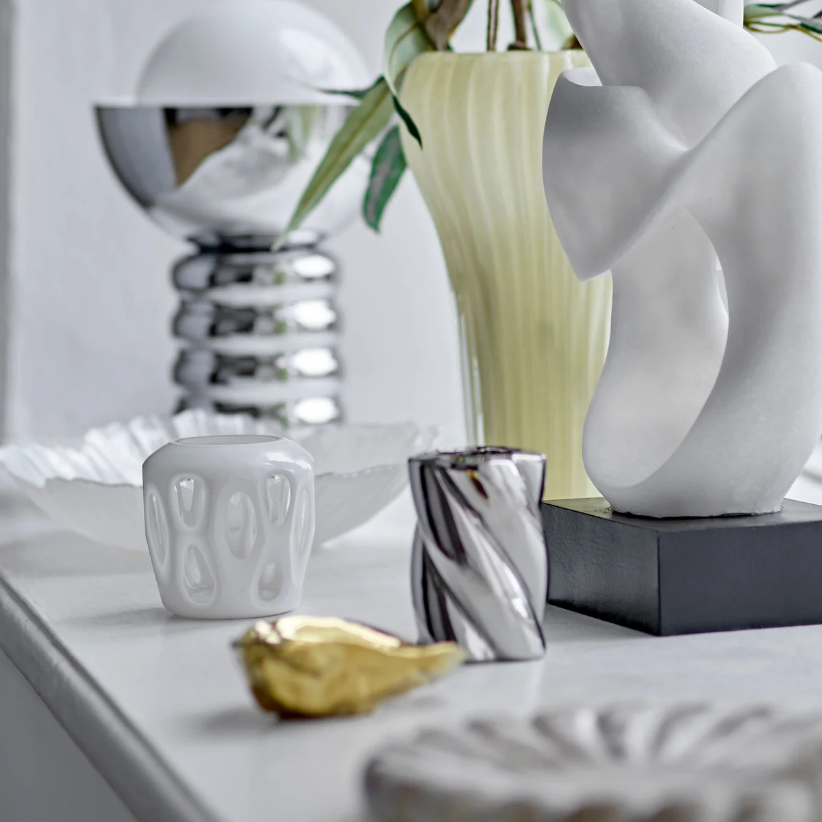 The Silvia candle holders from Bloomingville impress with their elegant, minimalist design. They are made from high-quality stoneware and have a silver-colored glaze that reflects the light beautifully and adds a sophisticated shine to any room. The shiny surface gives the candle holders a modern and festive look at the same time - ideal for setting the table on special occasions, but also as a stylish detail in everyday life.