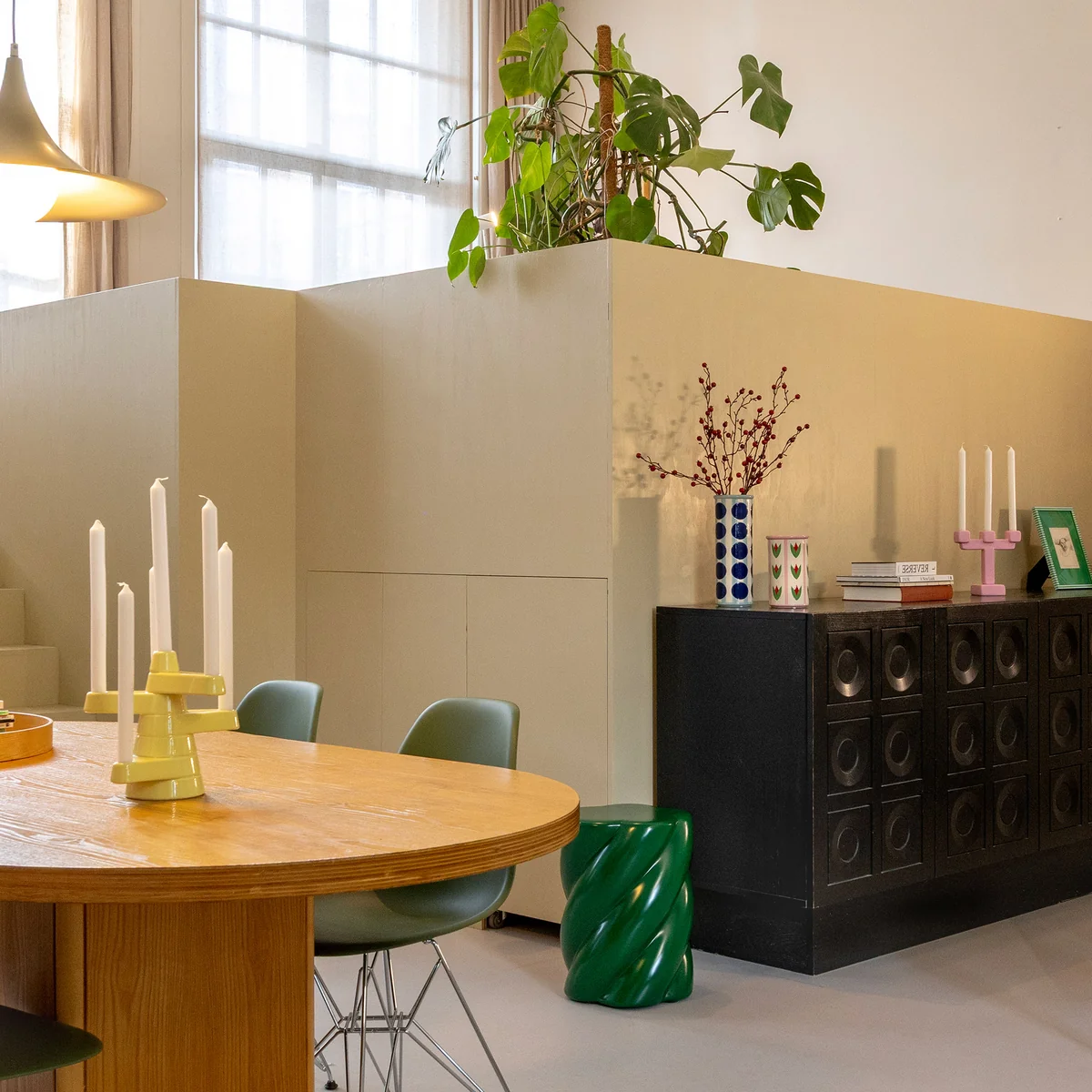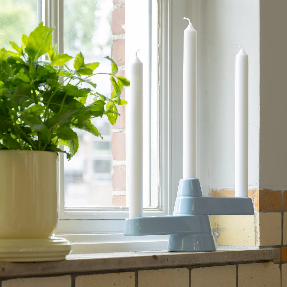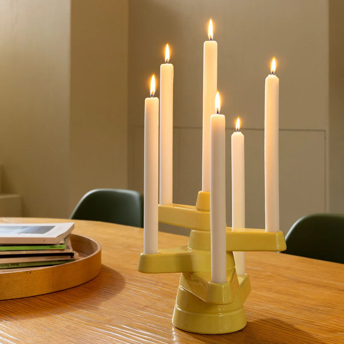 The Brute candle holder combines powerful shapes with shiny elegance. Its dynamically stacked silhouette is reminiscent of a sculpture in motion, yet remains stable and present. The high-gloss glazed ceramic reflects light and shadow in a fascinating way. Whether used individually or as part of an ensemble, this candle holder creates a modern accent in the room. With five arms, it offers space for up to six candles.