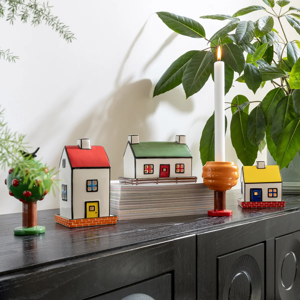 The Haines tealight holder was designed in collaboration with the English ceramicist and illustrator Hal Haines designed. The tree-shaped silhouette, hand-painted in vibrant colors, combines functional design with narrative design. The candle holder is suitable for both stick candles and tea lights and brings a playful, colorful atmosphere to any room. Ideal for combining with the tea light house from Hal Haines - for an individual miniature village full of light and fantasy.