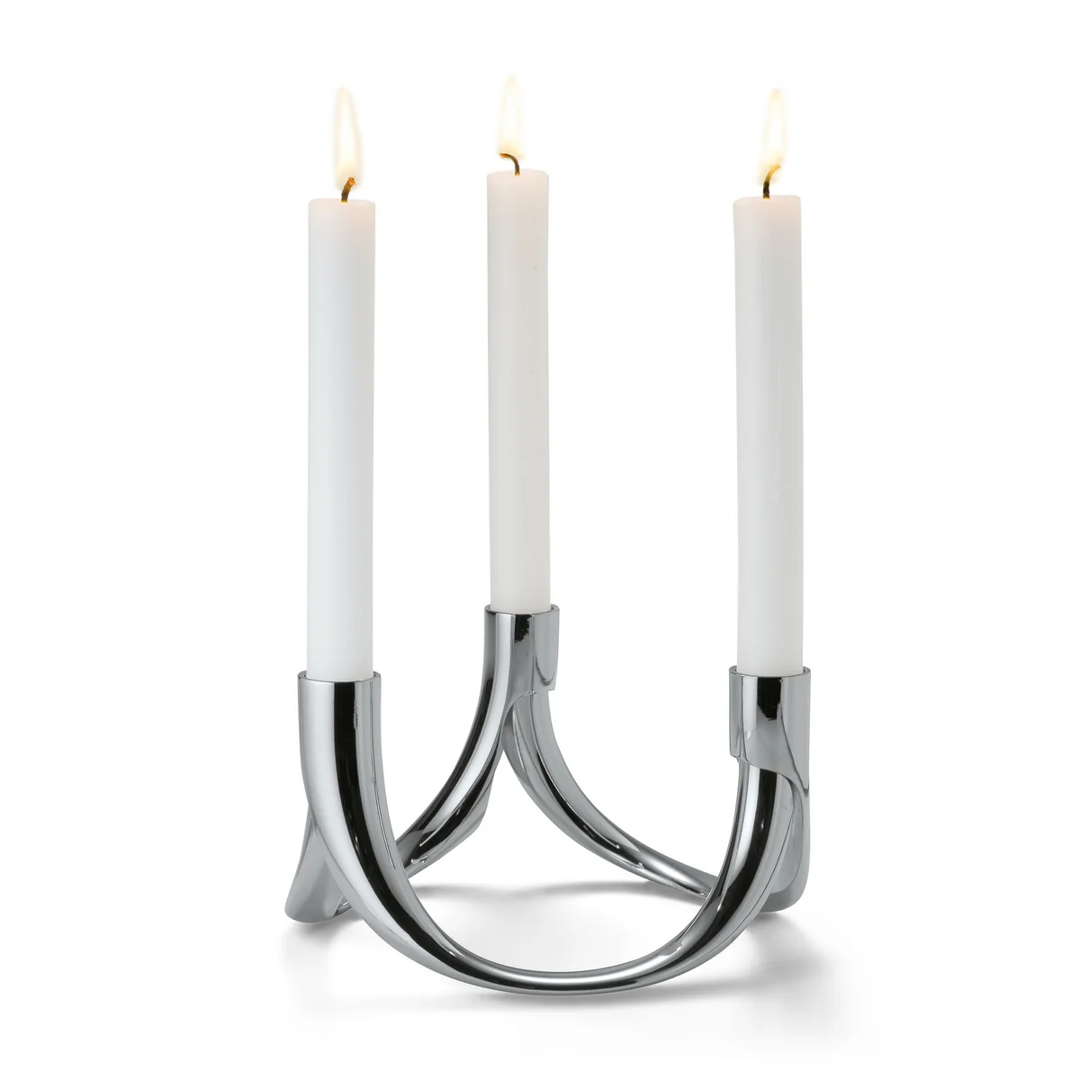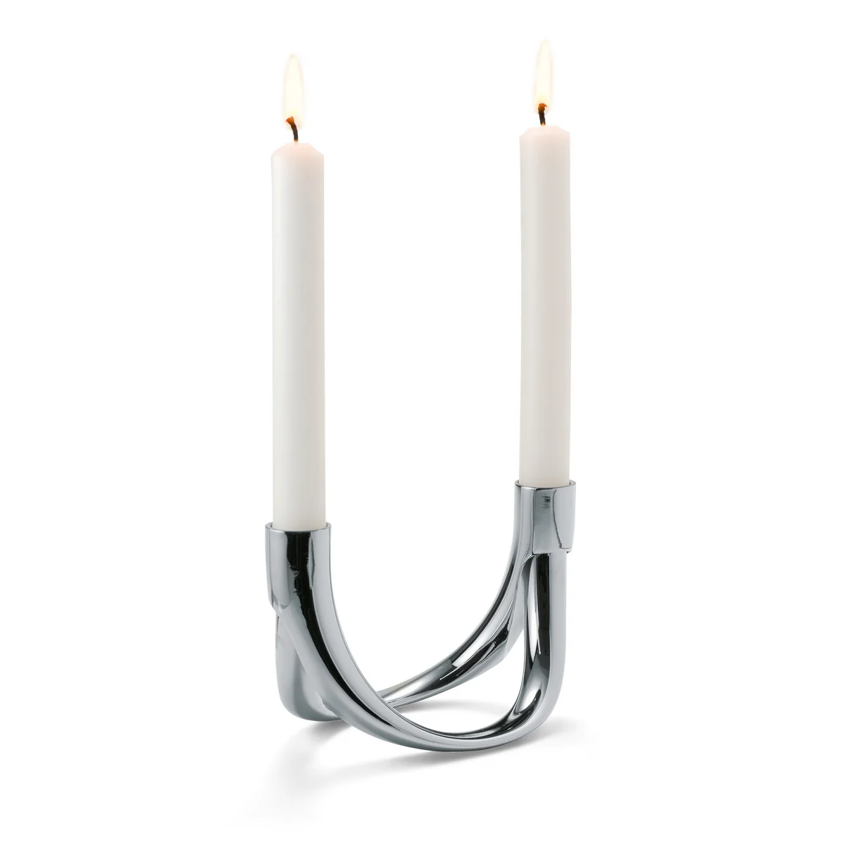 The Bow candleholder from Philippi is made of highly polished nickel and is available in various finishes.