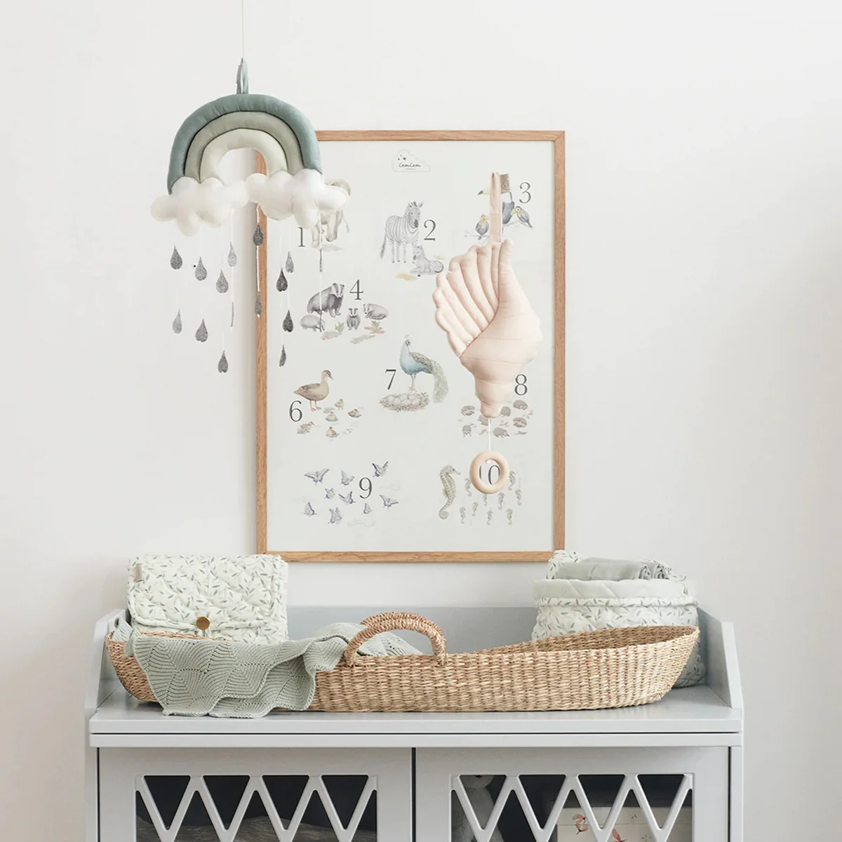 The rainbow mobile of the Danish manufacturer Cam Cam Copenhagen inspires with its delightful design. It can be hung above the crib or changing table depending on personal preference. The dreamlike rainbow is made of a material mix of organic cotton and polyester according to the Oeko-Tex standard. It is surrounded by cute raindrops made of felt, which gently sway back and forth with slight movements. Since the rainbow mobile is a handmade article, there may be slight product variations - each mobile is unique.