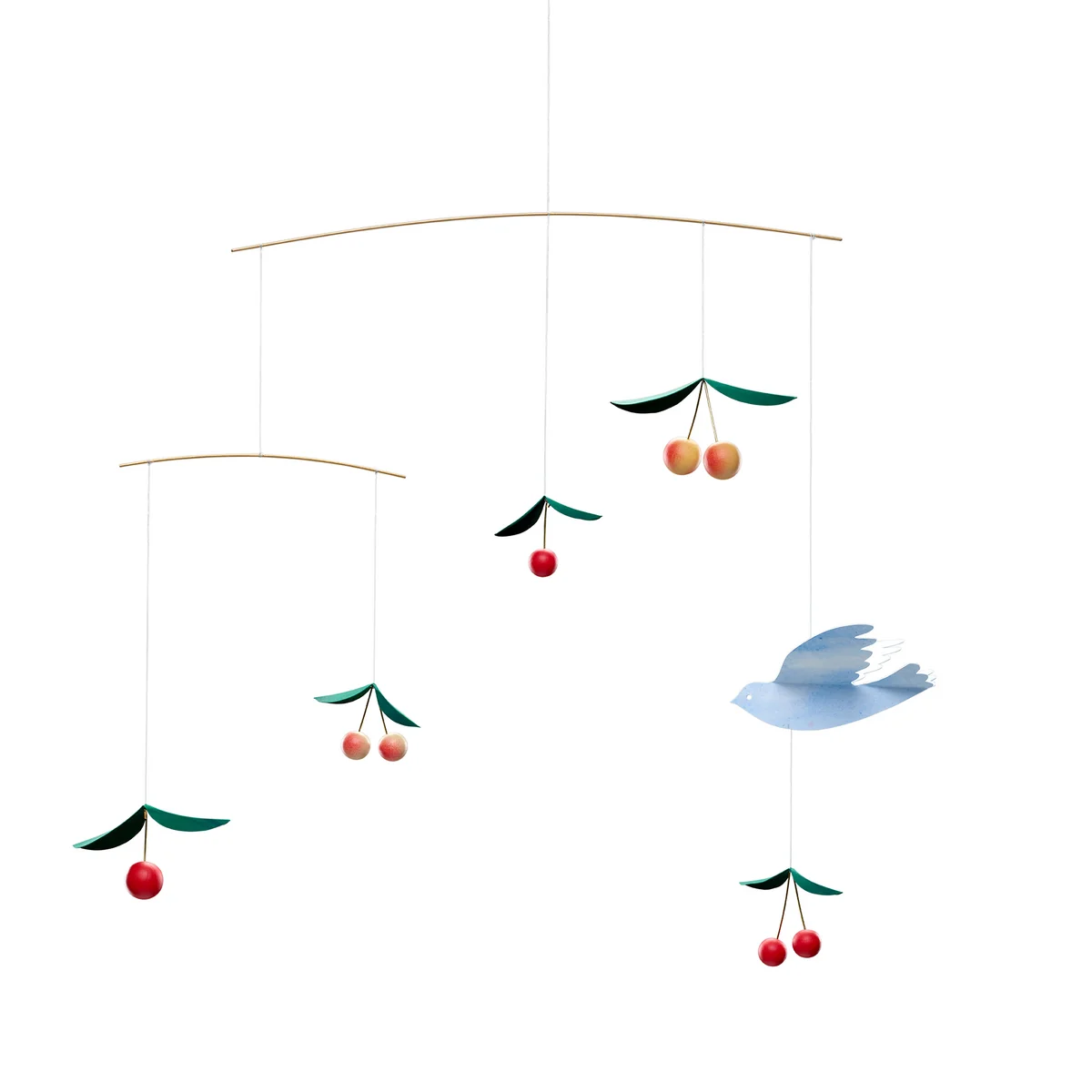 The charming Cherry Dreams Mobile is made of brass, cardboard and wood in fresh colors.