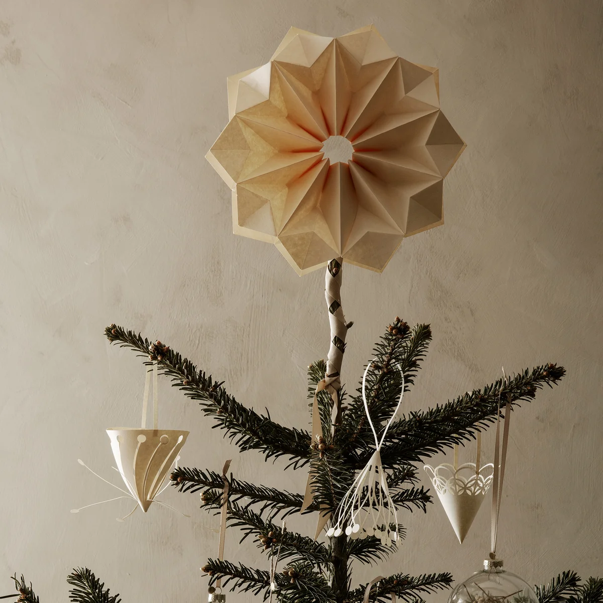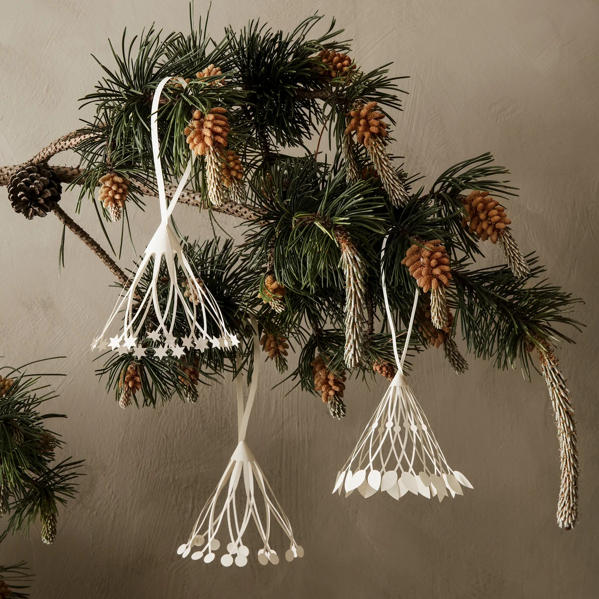 The elegantly shaped paper hangers by Ferm Living are a stylish and discreet highlight in the Christmas decoration. The ornamental cones were designed in collaboration with the Danish artist and architect Amanda Betz. The filigree pieces are laser-cut and folded by hand. They are made of FSC™-certified paper and have a matt, smooth surface.