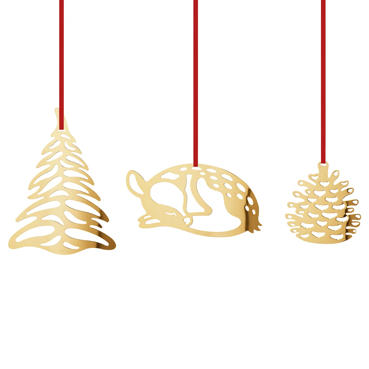 The Large Christmas ornament by Sanne Lund Traberg for the Danish manufacturer Georg Jensen inspires with its minimalist elegance. The set of 3 made of 18 carat gold-plated stainless steel includes the favorites of the 2023 collection. The ornaments can be arranged as eye-catchers individually in the home interior or combined on the Christmas tree.