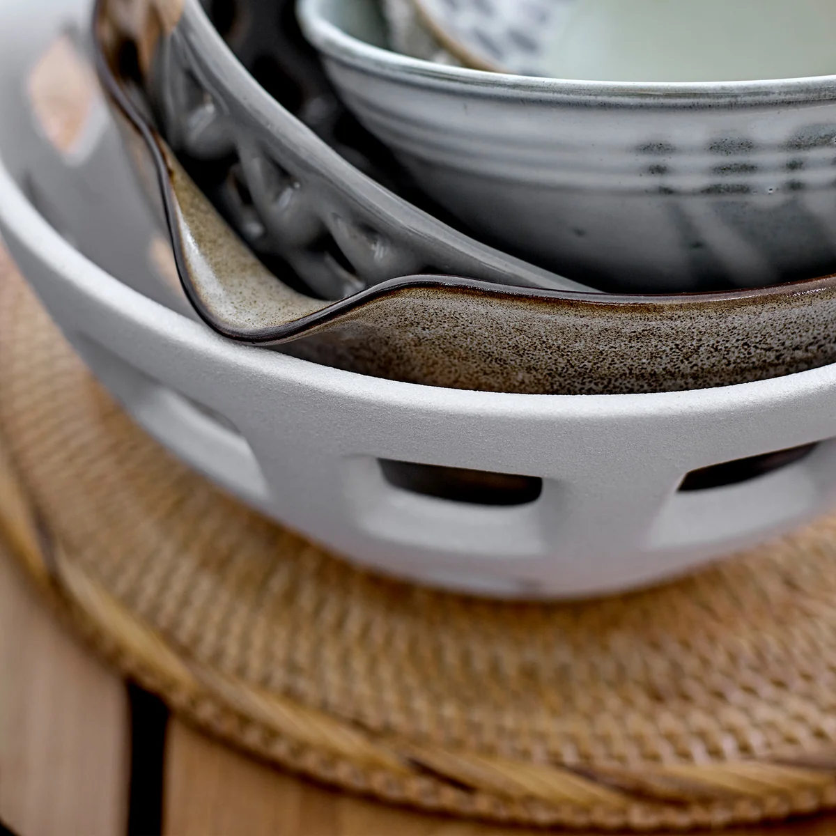 The Foligno Bowl from Bloomingville presents a sculptural design that stands out from the rest of the dinnerware. The beautiful bowl has hollow holes that shape it into a great fruit basket or a stunning bread bowl where the contents are visible.