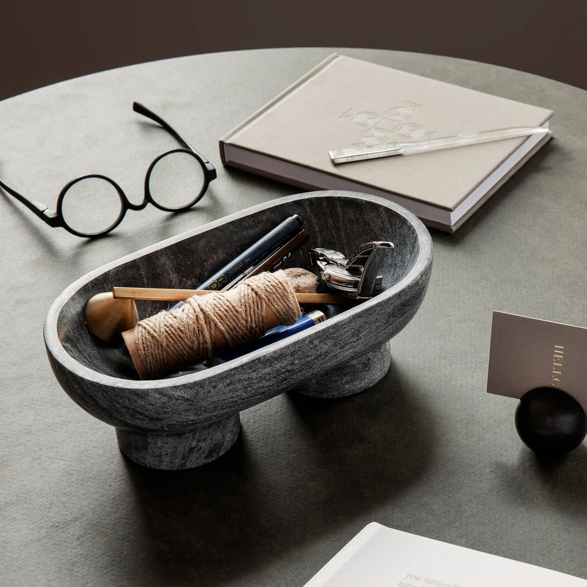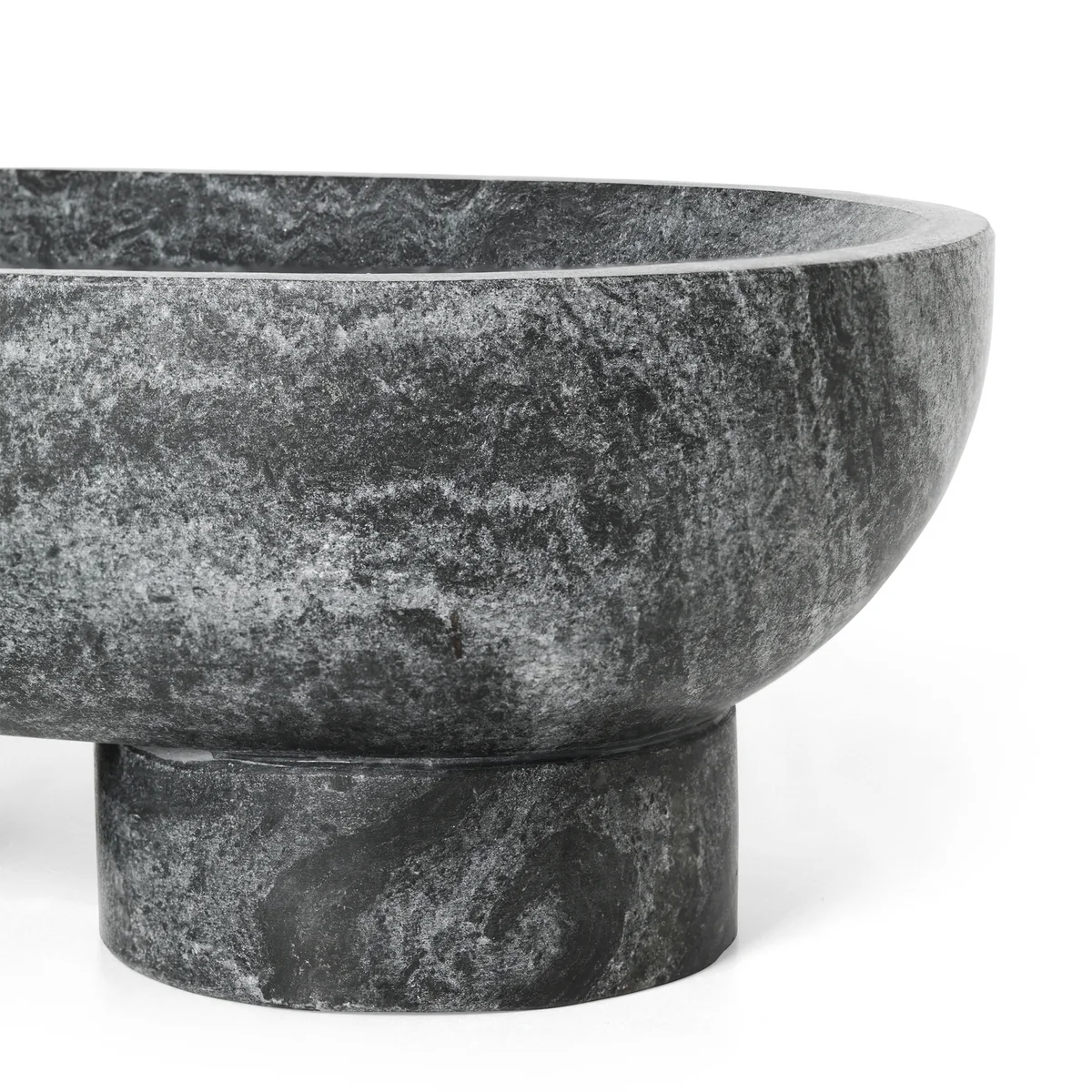 The bowl is made of black Selvaras marble from India or Indian Banswara marble in white. The material and the shape of the bowl combine heavy and light contrasts and create a marble bowl that is decorative in the kitchen or living room. The bowl can be used to serve pastries or sweets or to decoratively store keys and paperclips.