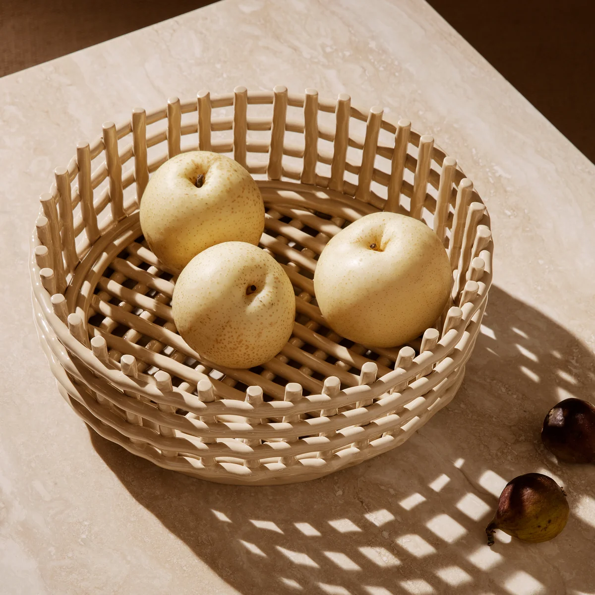 The ceramics Centerpiece from Ferm Living is a unique basket for the dining table. It combines the traditional Danish craftsmanship of basket weaving with pottery. With its subtle colors and timeless lattice look, it is ideal for the dining room and kitchen. The Centerpiece can be used as a fruit bowl, a bread basket, for snacks and treats, or even for storing personal items.