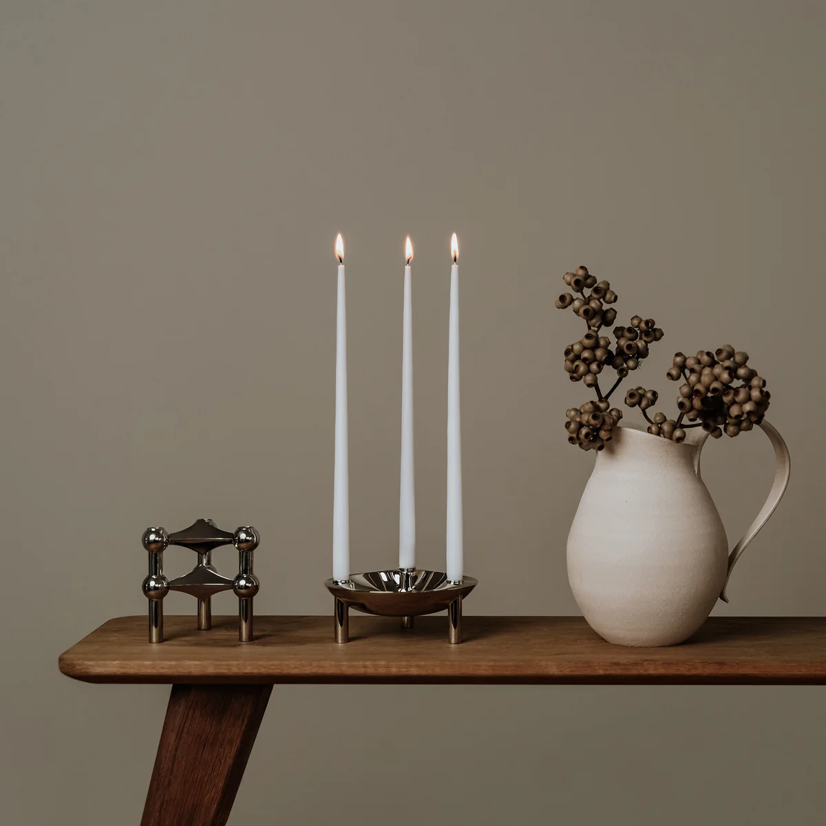 It is both bowl and candlestick and offers just like the classic Stoff Nagel candle holders in the spheres, it offers space for three stick candles. The special feature: Any number Stoff Nagel candle holders and bowls can be combined with each other due to the plug-in system. This creates sculptural constructs that enhance any living area and become an absolute eye-catcher.