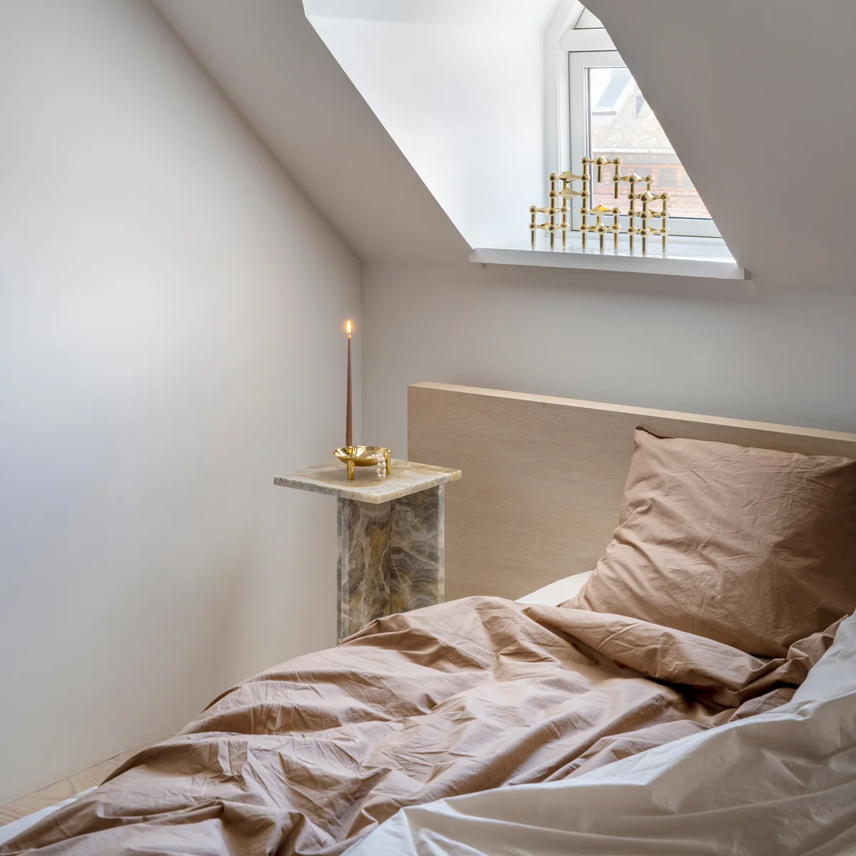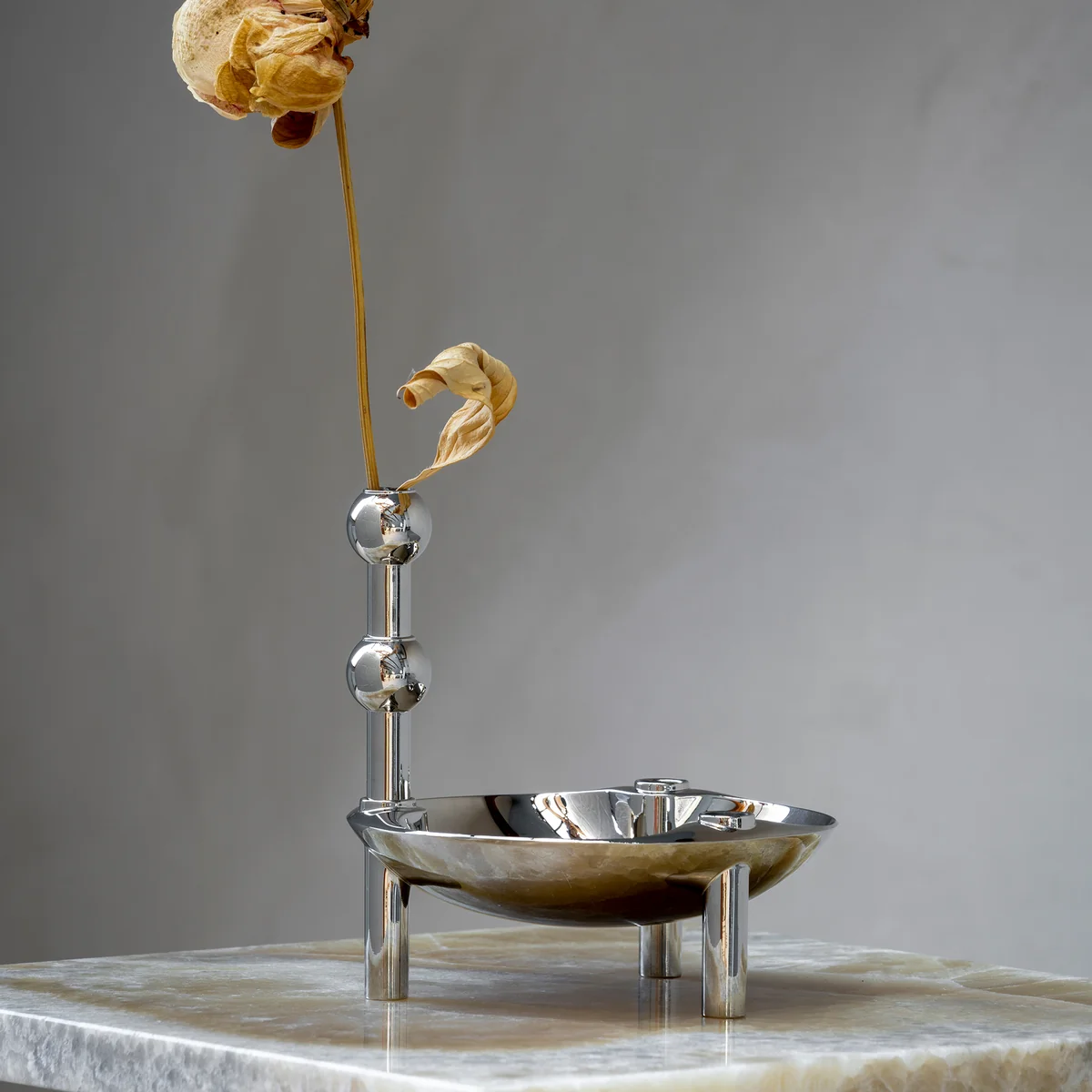 Both alone and plugged together and with or without candles, the bowl looks timelessly elegant. It is available in brass, chrome or steel, painted in a matte black, and looks great on the dining table, on the shelf or on a side table. In it, keys, fine jewelry, home-baked cookies and much more will find a stylish place.