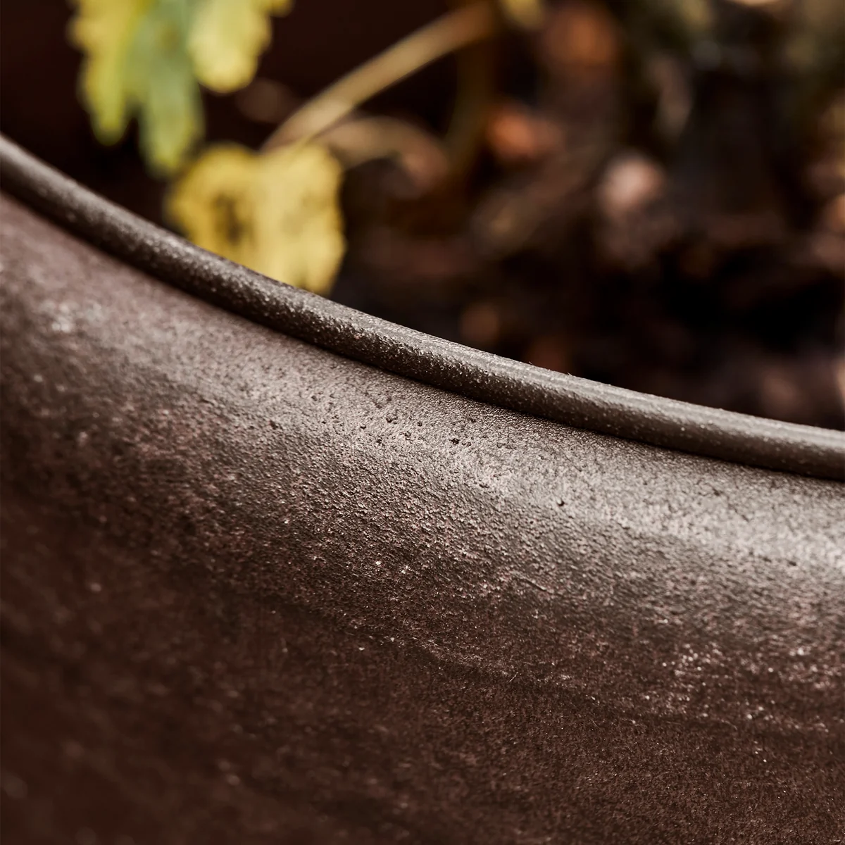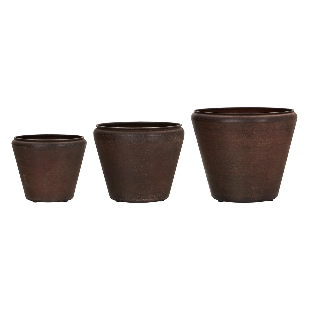 This set of three flower pots gives patios and balconies a modern and elegant look. The conical shape and matt, antique brown surface stylishly showcase plants and flowers. Made from recycled steel, each pot combines sustainability with unique texture. The integrated drainage holes with plugs ensure easy handling and versatility.