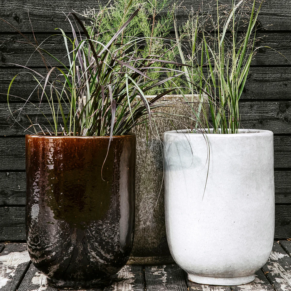 The pots are made of ceramic and have been given a unique decorative glaze that makes each pot unique. The pots can be staged with plants that can be customized to match the decor style, adding personality to the patio. The flower pots have a hole in the bottom and are frost-proof up to -20 degrees.