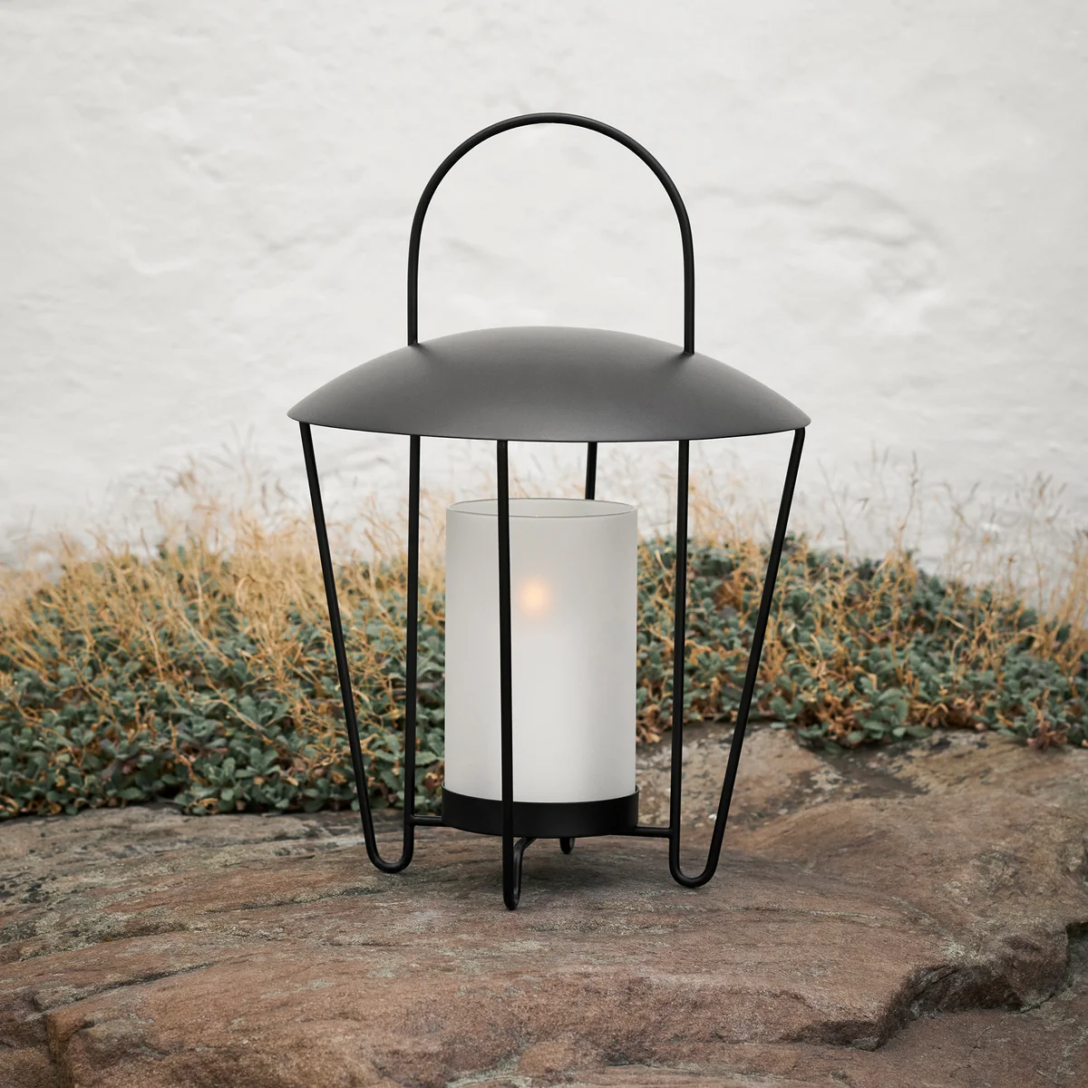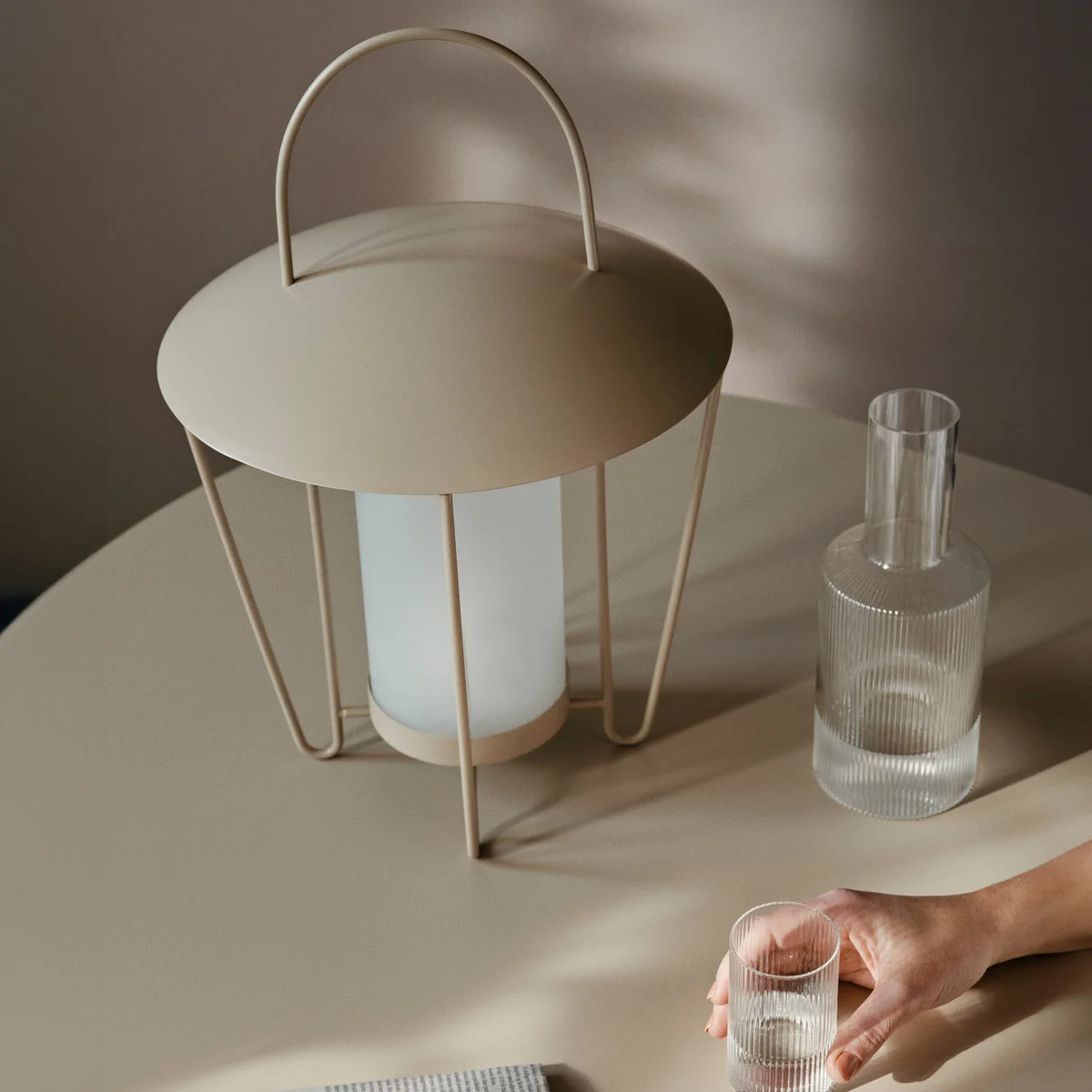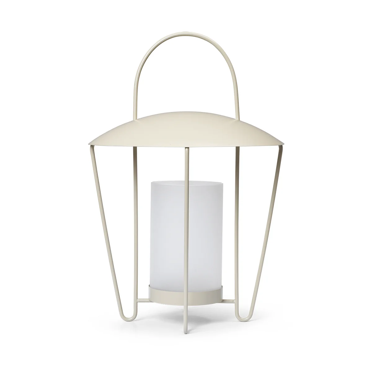 The Abri lantern from Ferm Living is derived from the French word for "protection" and thus also reflects its purpose. Abri With its elegant silhouette and sophisticated design, this lantern creates a safe and calming atmosphere. It is made of powder-coated stainless steel with a curved top. The frosted glass provides soft light, while the practical handle allows the lantern to be transported from place to place.