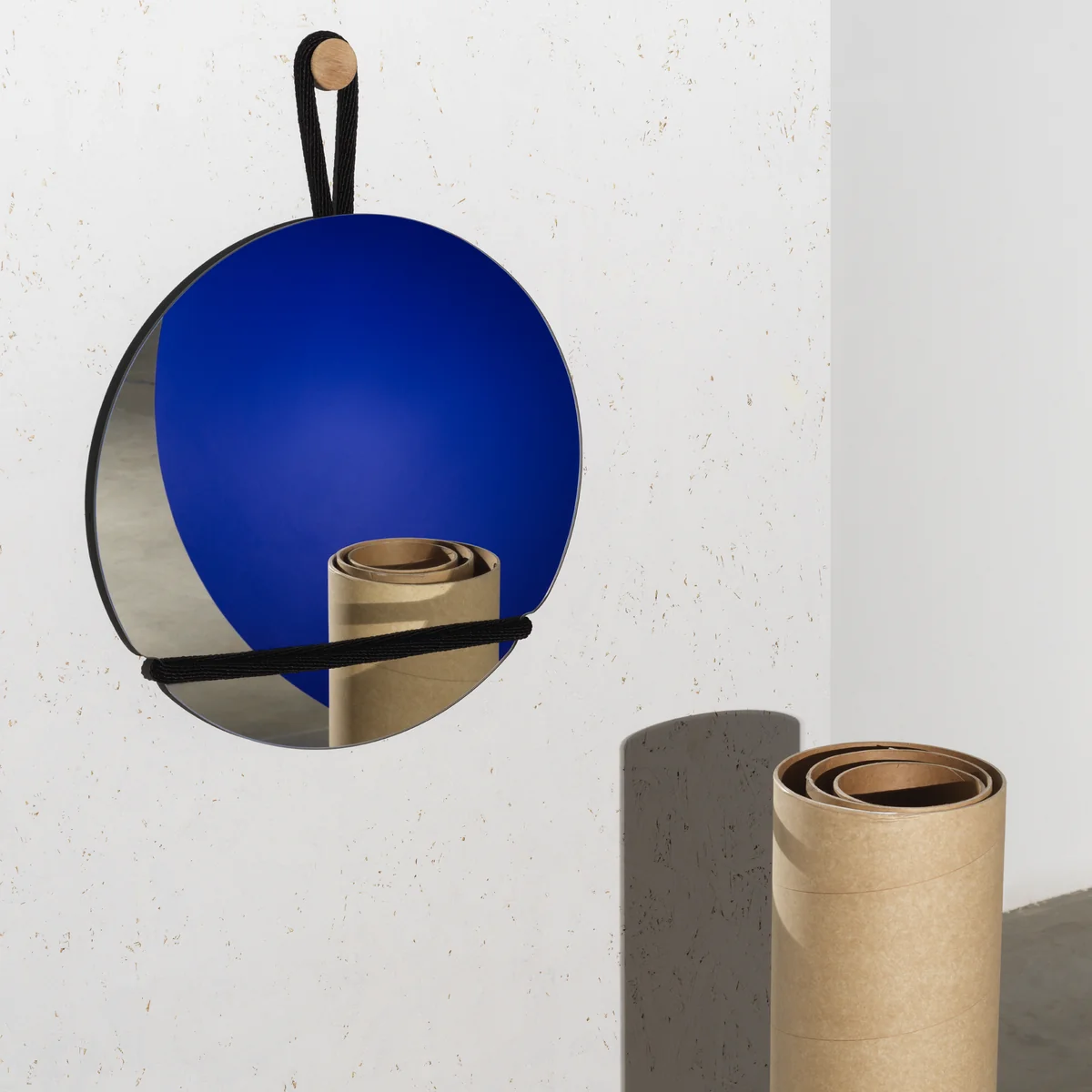 A note, a card or some kind of memory can also find its place behind the thickly woven textile rope that clings to the glass. The Lasso wall mirror is available in different shapes.