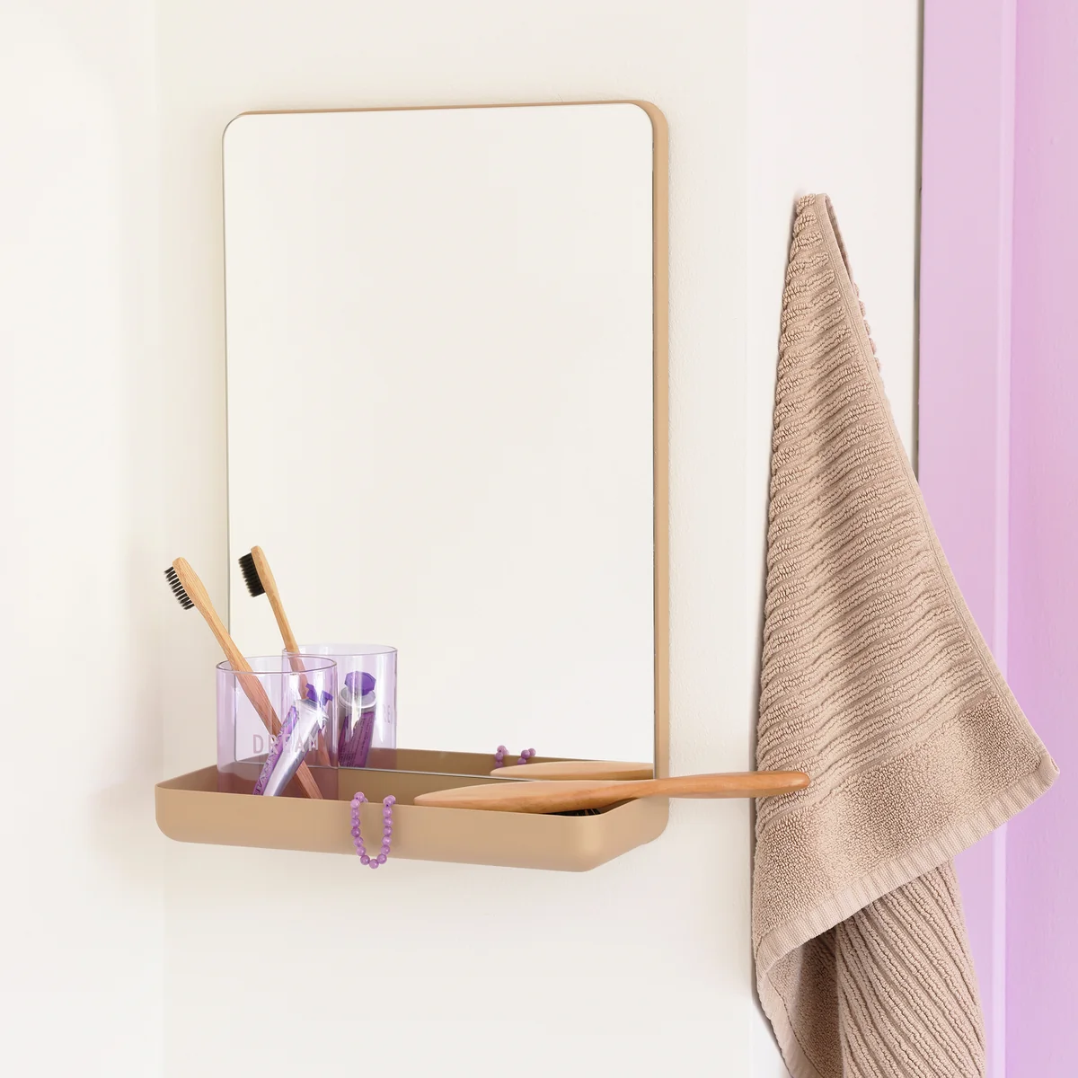 The Design Letters hanging or standing mirror with shelf embodies a successful symbiosis of style and practicality. Its modern Scandinavian design integrates effortlessly into various room concepts and at the same time provides a practical storage space for personal items.