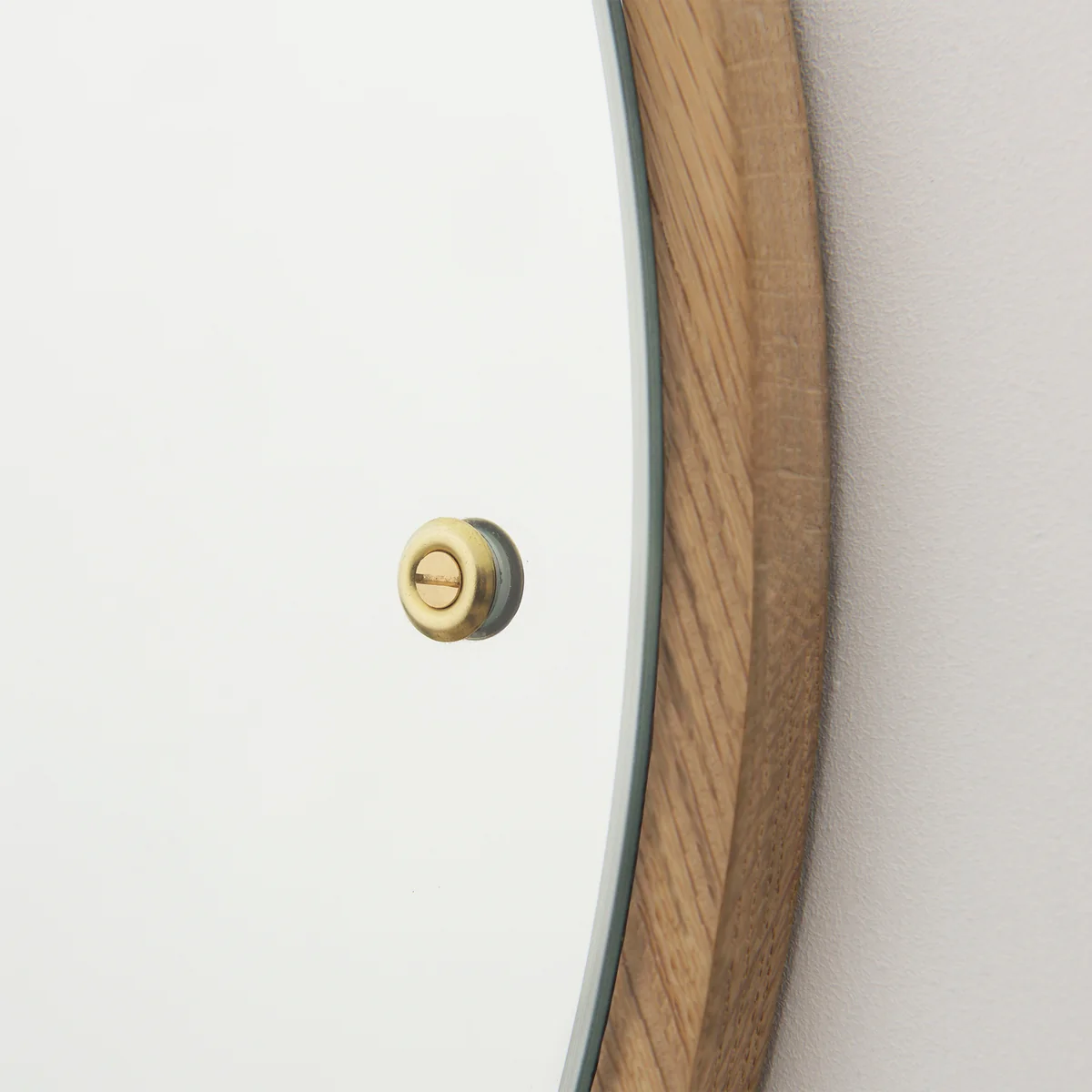 The round mirror is mounted on a plate of solid oak wood on the wall and held in place by visible screws, which are a design homage to the 1950s.