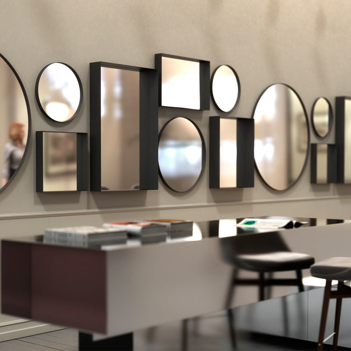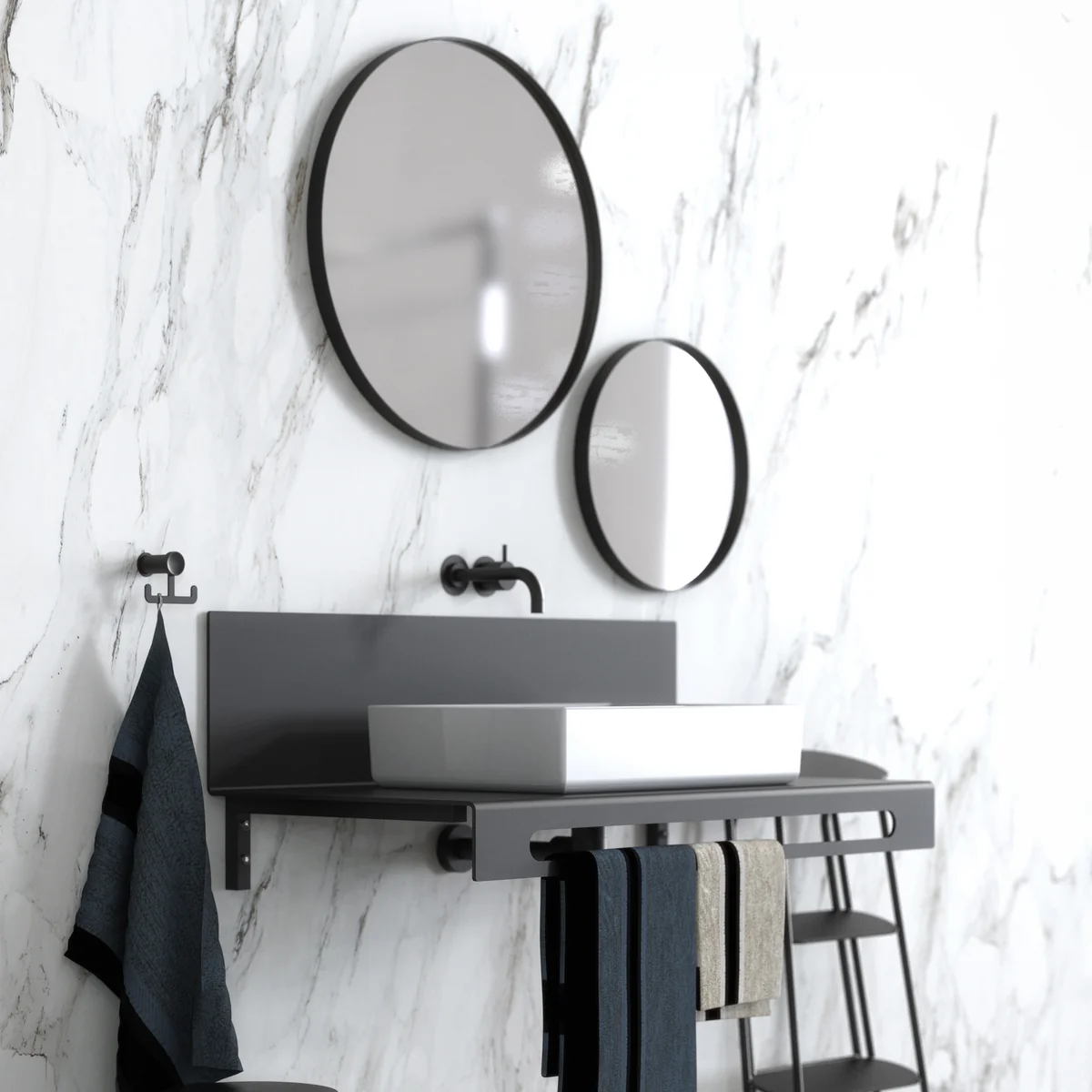 The mirror glass is framed in a narrow aluminum frame, which provides a defined contour and is available in different colors. The mirror designed by the Bønnelycke design studio is available in different diameters.