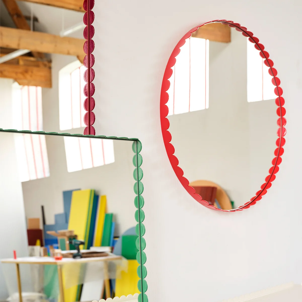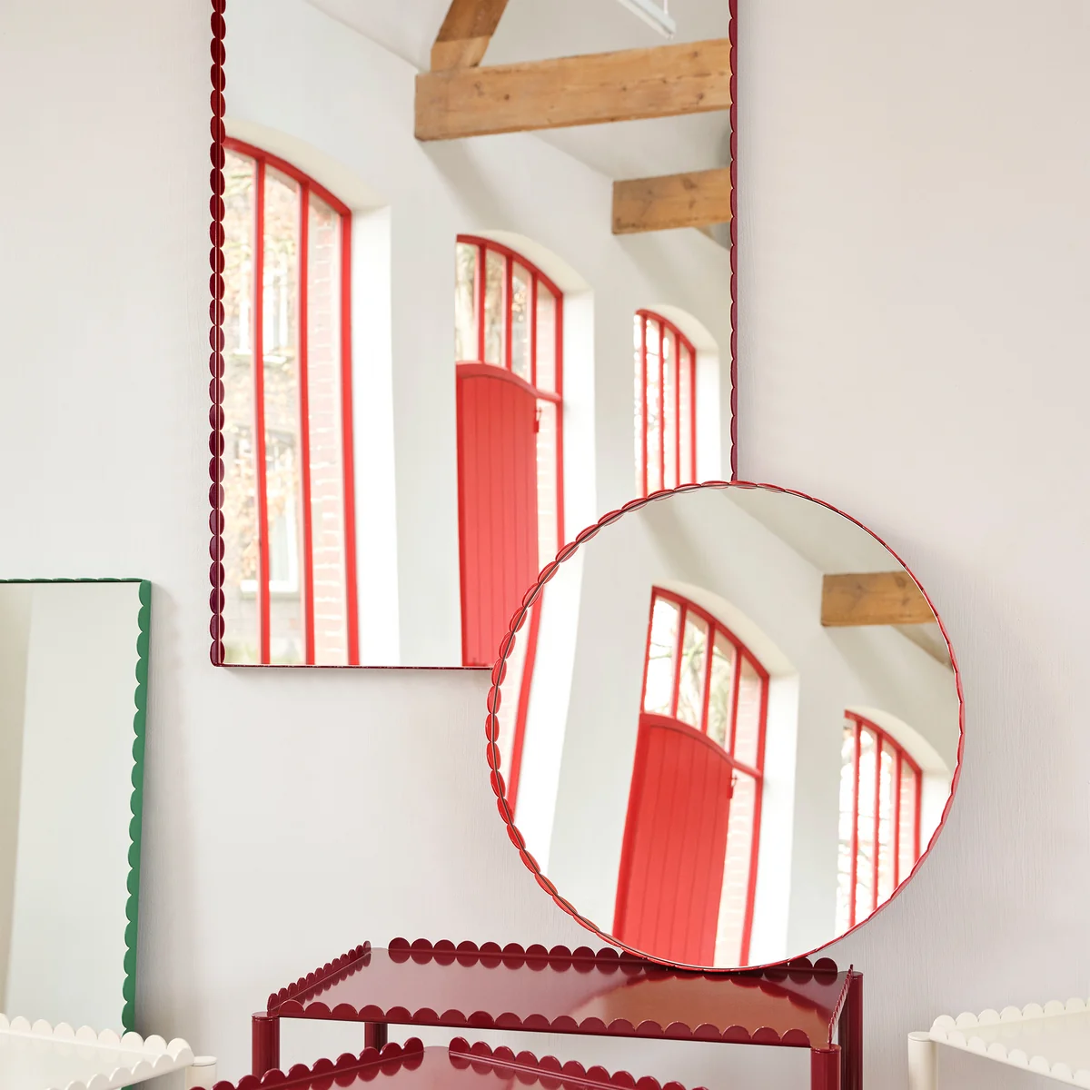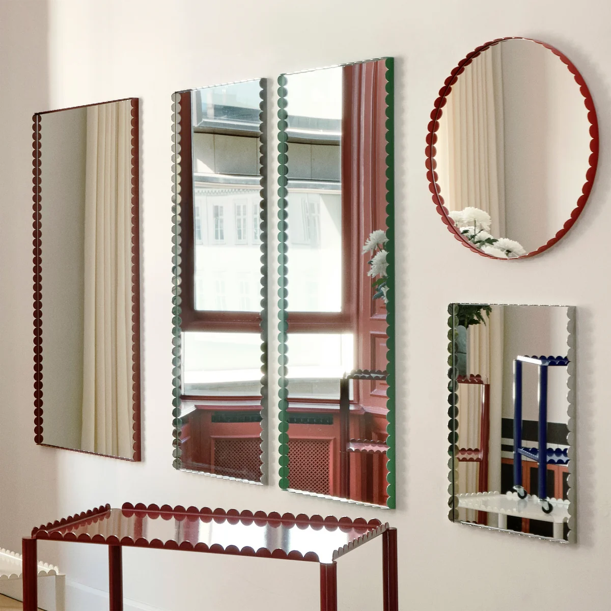 The Arcs mirror by Belgian duo Muller Van Severen for HAY consists of a continuous chain of vertical arcs that enclose the mirror, creating an elegant wavy edge. Arcs Is made of mirrored stainless steel and powder-coated steel in a variety of colors.