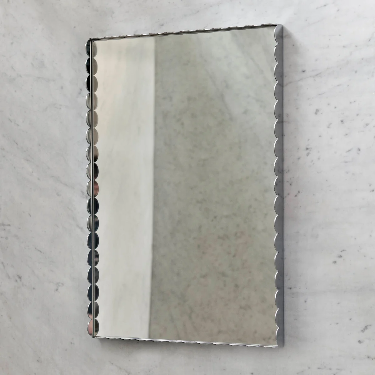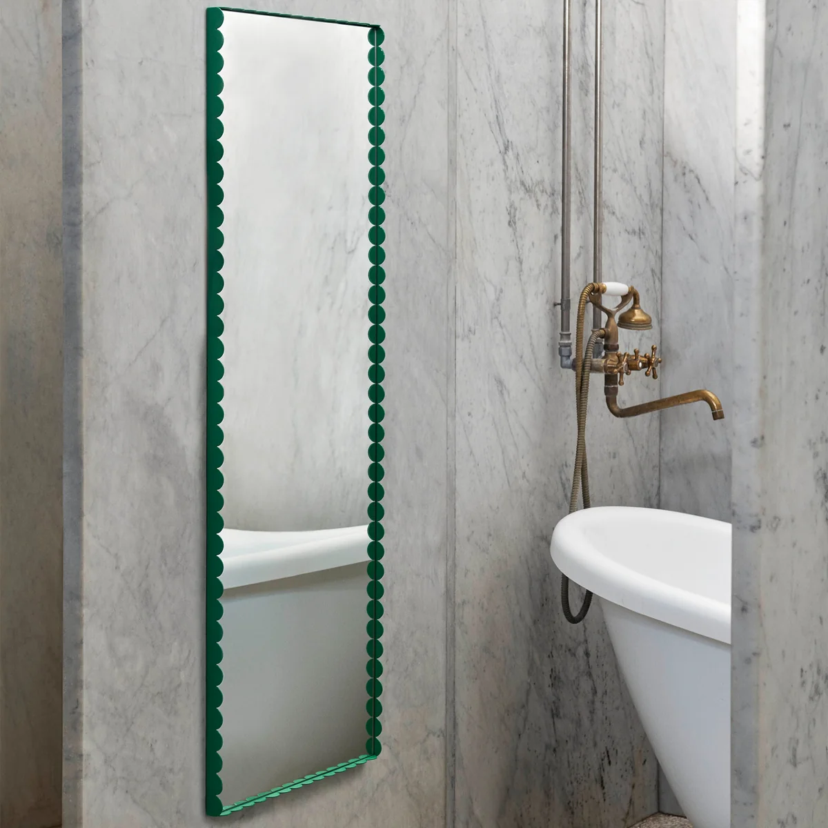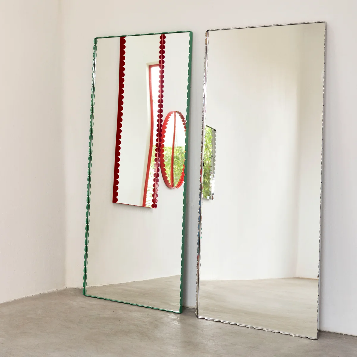 The Arcs mirror by Belgian duo Muller Van Severen for HAY consists of a continuous chain of vertical arcs that enclose the mirror, creating an elegant wavy edge. Arcs Is made of mirrored stainless steel and powder-coated steel in a variety of colors.