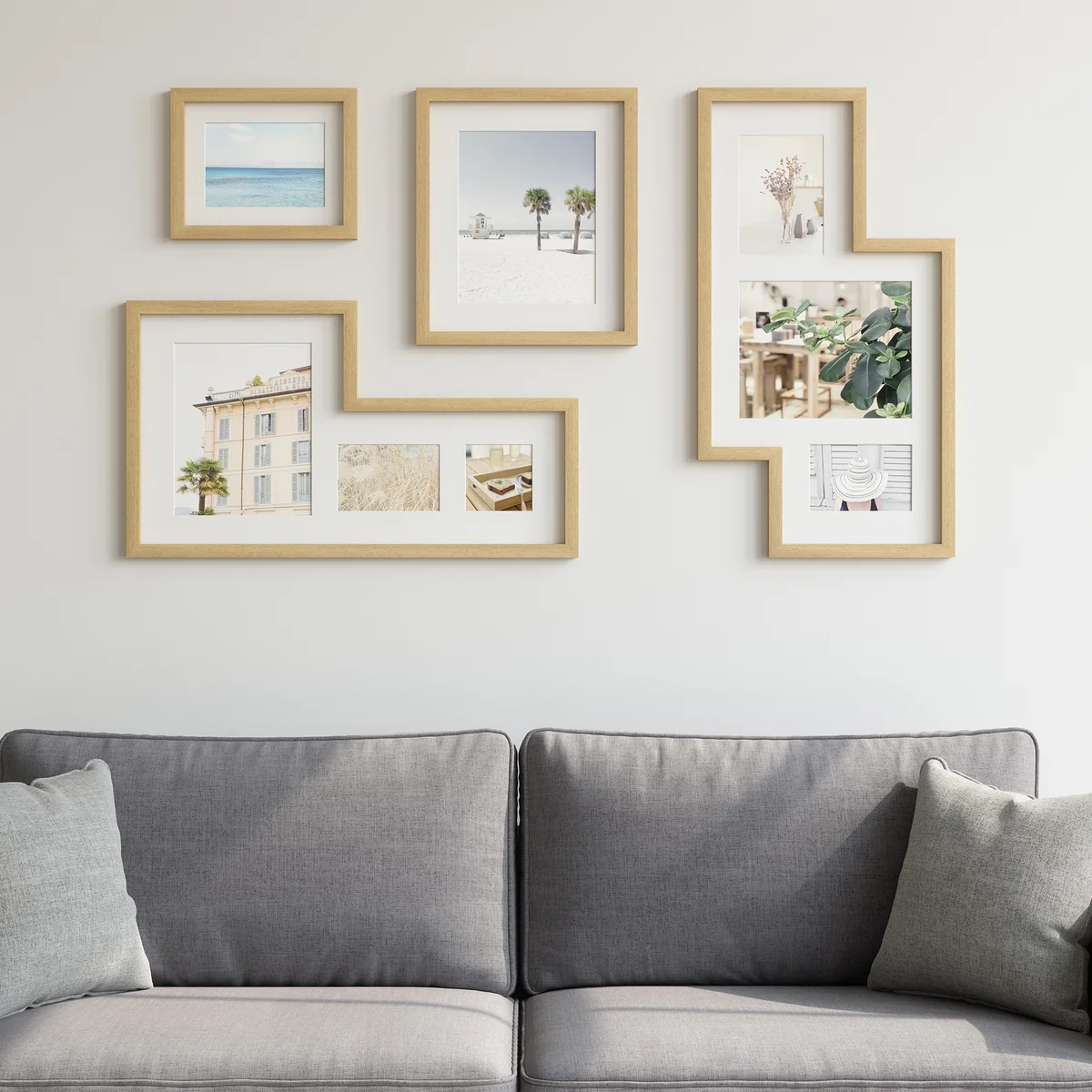 The unusually shaped frames offer space for a 10x10 cm, a 10x15 cm, a 13x18 cm and a 20x21 cm picture. There are therefore no limits to your imagination to create a completely new kind of gallery in the living room, bedroom or hallway.