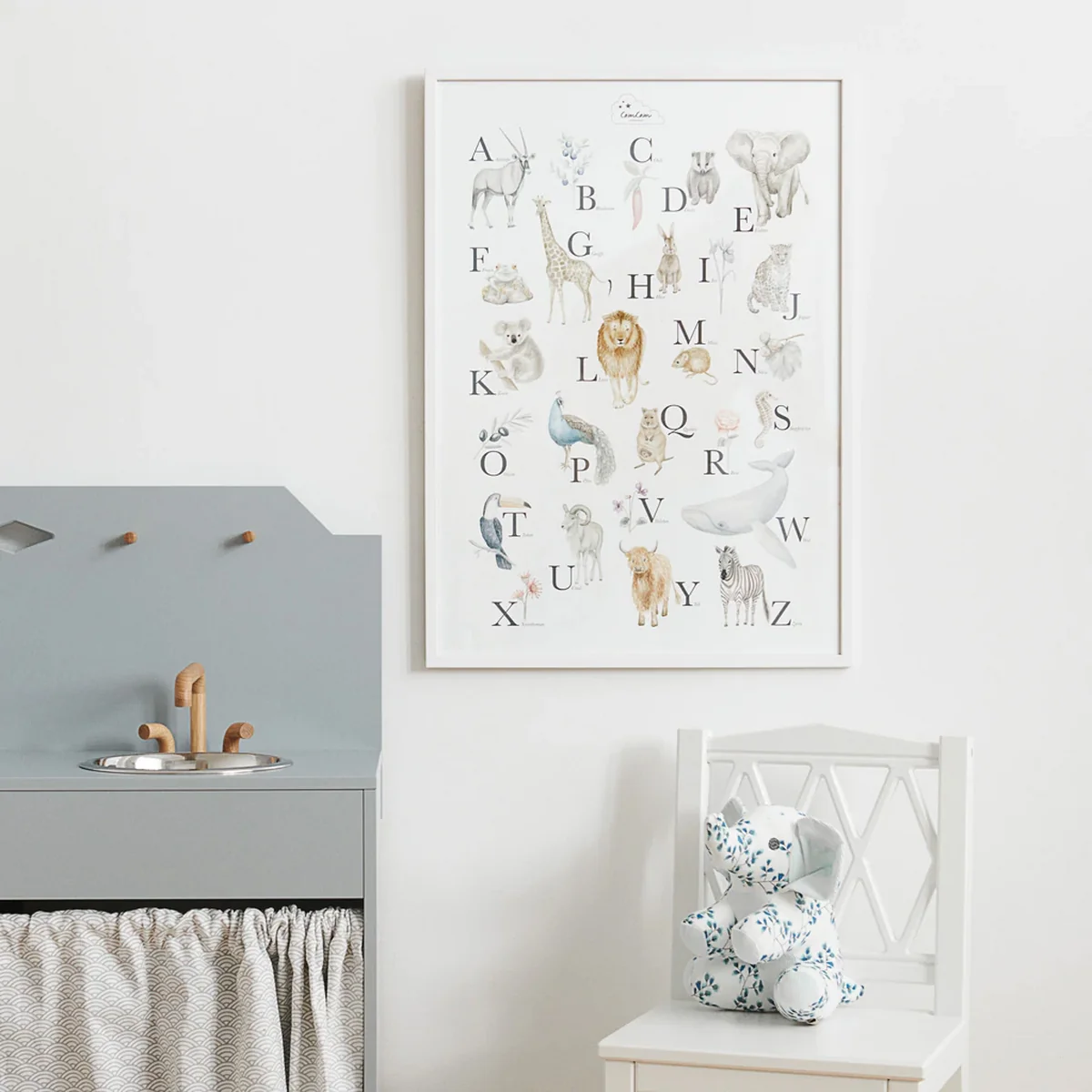 The Alphabet Poster from Cam Cam Copenhagen holds great educational value, simplifying children's learning of the alphabet, in a fun way. The poster presents beautiful hand-drawn illustrations inspired by classic flora and fauna prints. The combination of letters and drawings stimulates the natural curiosity and eagerness to discover of the little darlings. The Alphabet Poster allows the child to learn the ABCs in a homey environment and provides the perfect opportunity for contemplative and creative moments in pairs.