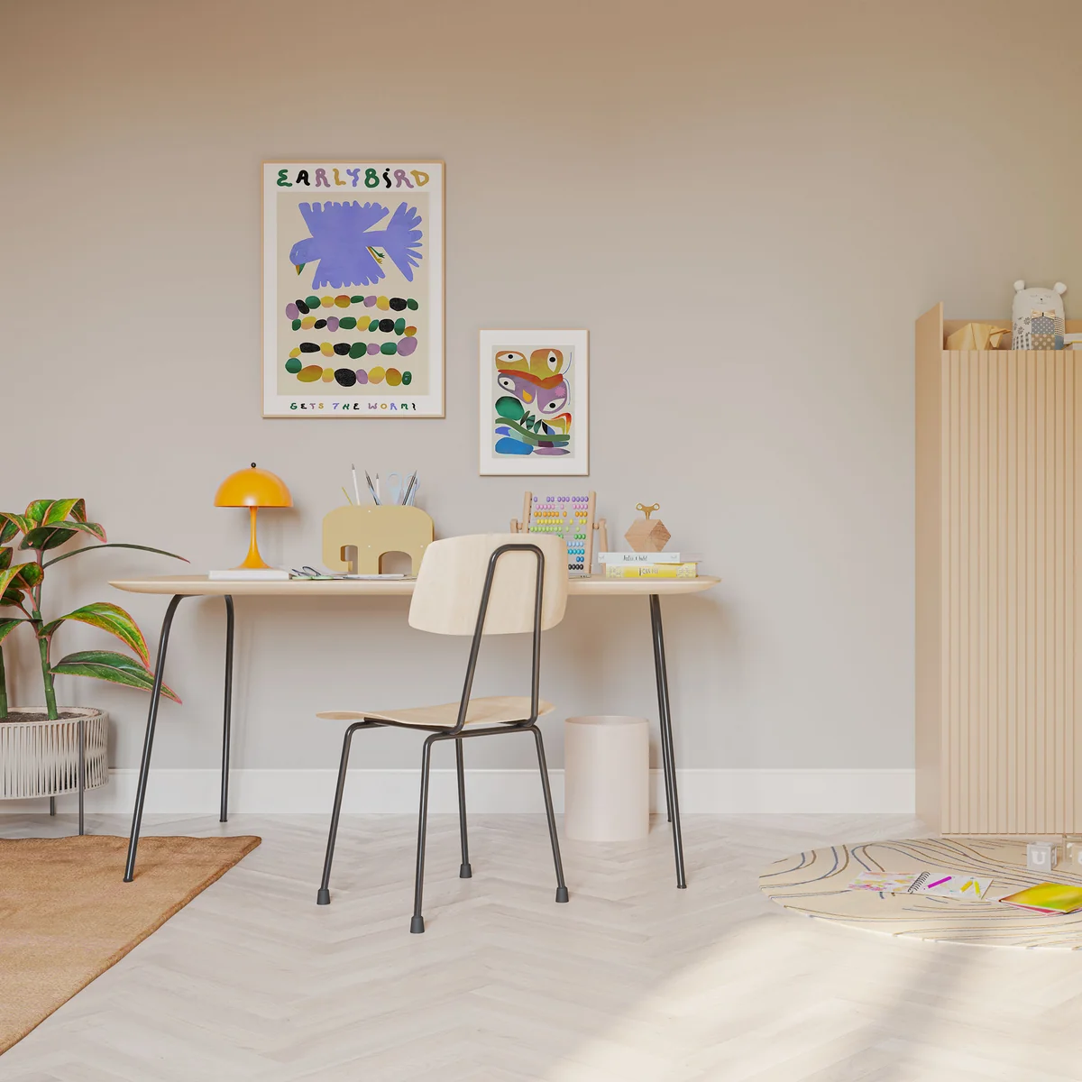 The Early Bird Gets The Worm Poster by Imogen Crossland for Paper Collective captivates with its playful motif. In the stylized world of colors and hand-cut shapes, a beautiful blue bird flies over a single worm that looks like a collection of pebbles. The poster is handmade and curated in Copenhagen. Early Bird Gets The Worm Is produced under the Swan certification system. Available in different sizes.