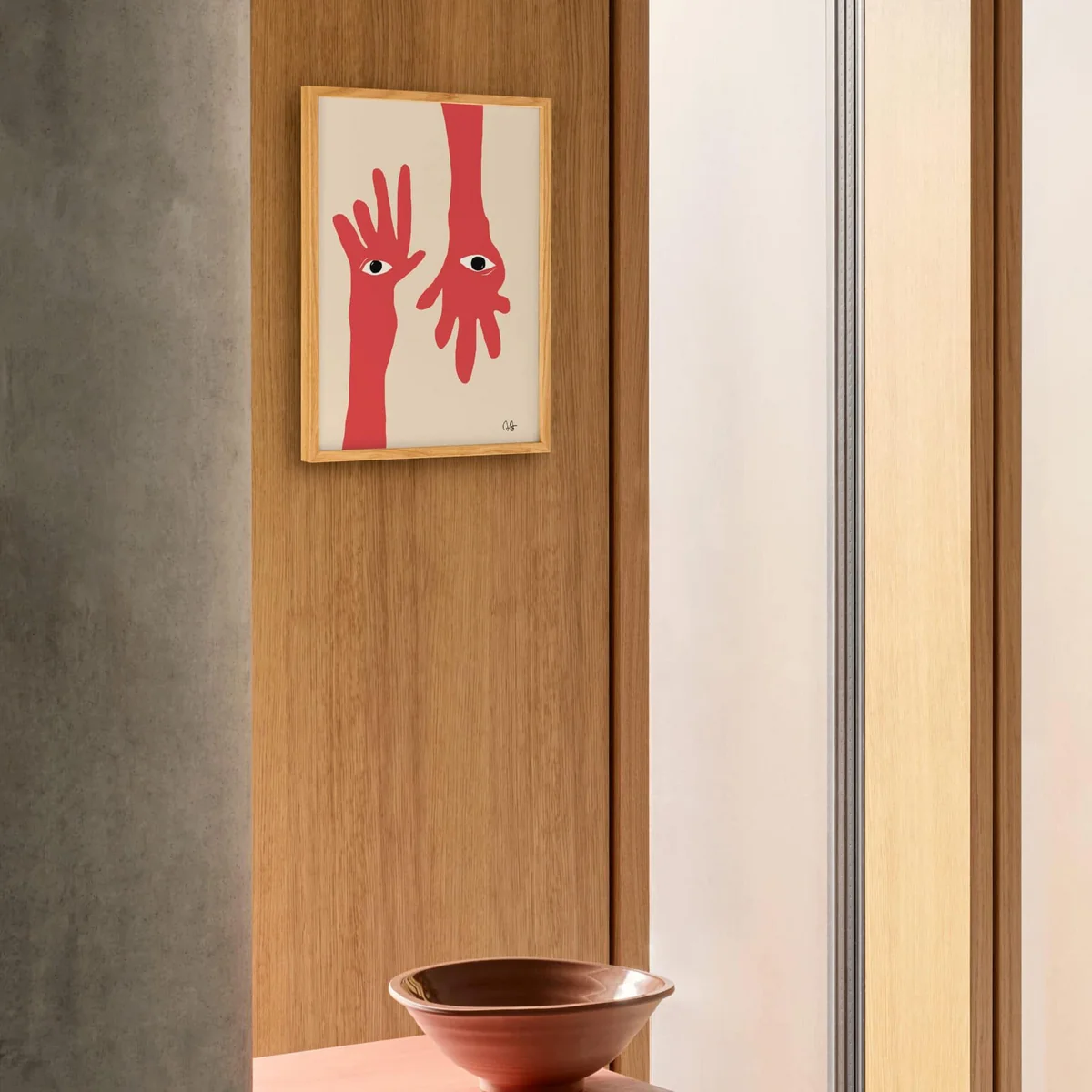 The Hamsa Hands Poster of Paper Collective plays with the abstract and the spiritual, with two red hands dangling from the top and bottom of the picture. In the middle two eyes meet, which are connected to create a face from two separate worlds.