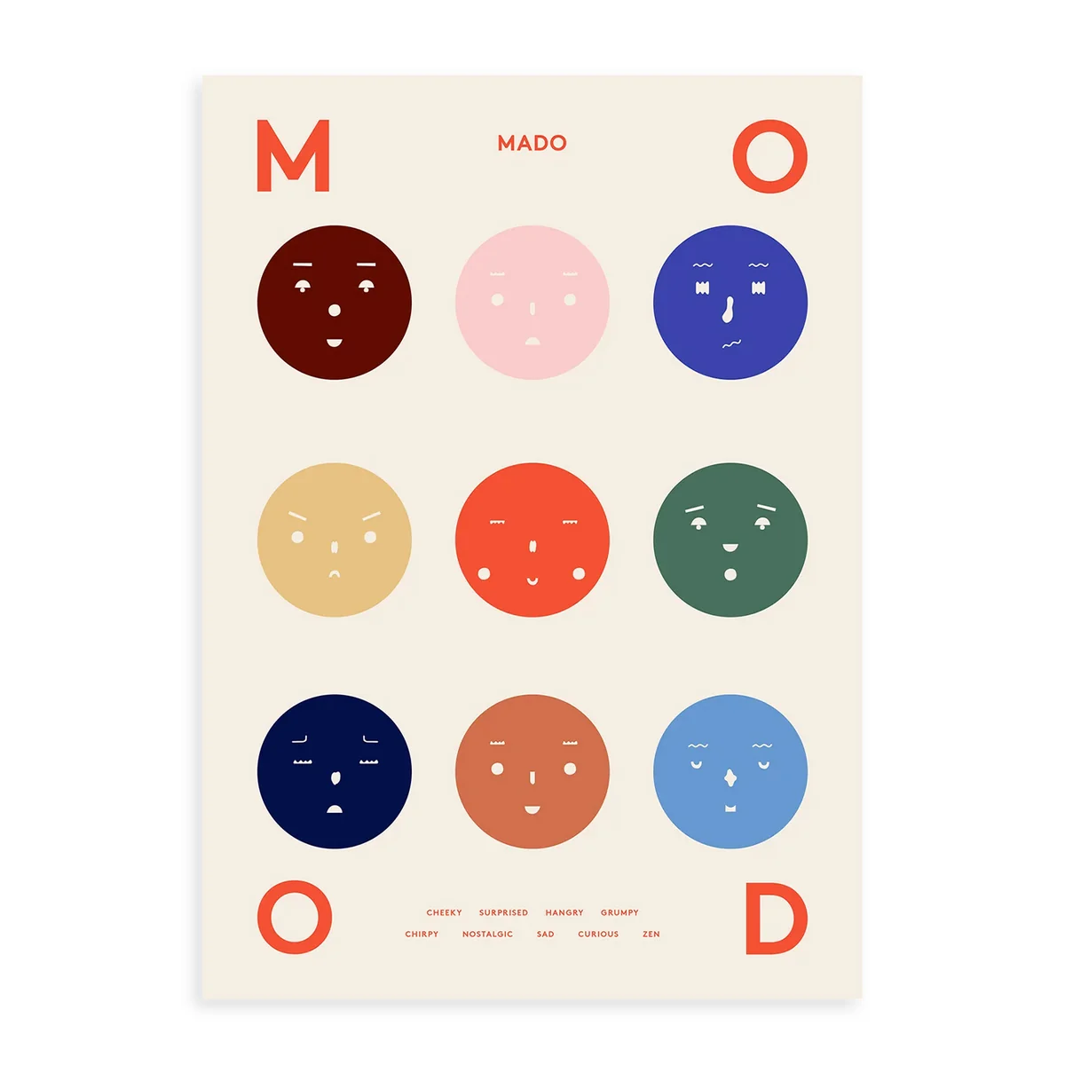 The Mood poster shows all the feelings you experience in life - whether young or old, it is always a good idea to talk about and understand the feelings you experience in your everyday life and to do so in a fun and colorful way. The Mood poster is part of the MADO series, which was created in close collaboration between the two Copenhagen design studios All the Way to Paris and Paper Collective .