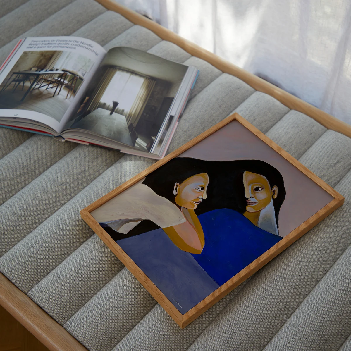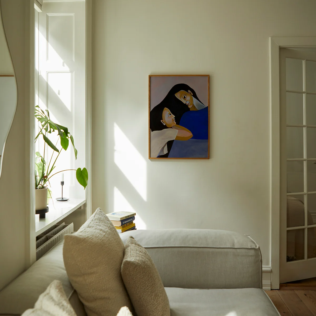 The design of this poster shows two women, sisters, lovingly facing each other. The bond between them is clearly visible on their faces and in their posture. The soft lines and the restrained color palette give the artwork a timeless elegance and make it an eye-catcher in any room.