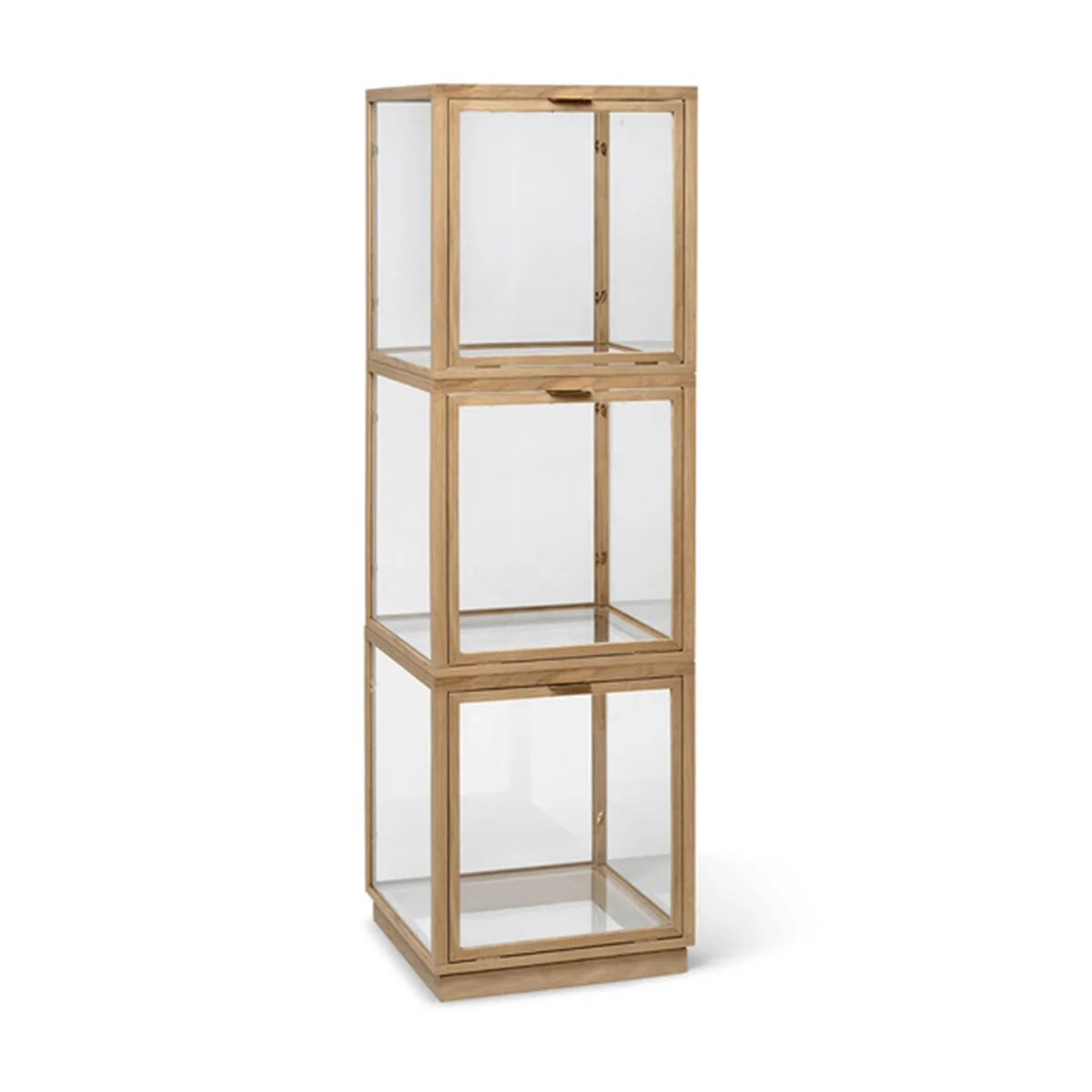 In the Miru glass display cabinet by Ferm Living is a decorative way to store and present your favourite things. Whether vases, books, ornate figurines or family heirlooms. The stackable boxes fit great into any interior and bring an artistic touch to the home. Depending on your taste or room, the glass boxes with the oak frame can be placed individually or combined together. The separately available base serves as a decorative frame on which the boxes can be placed.